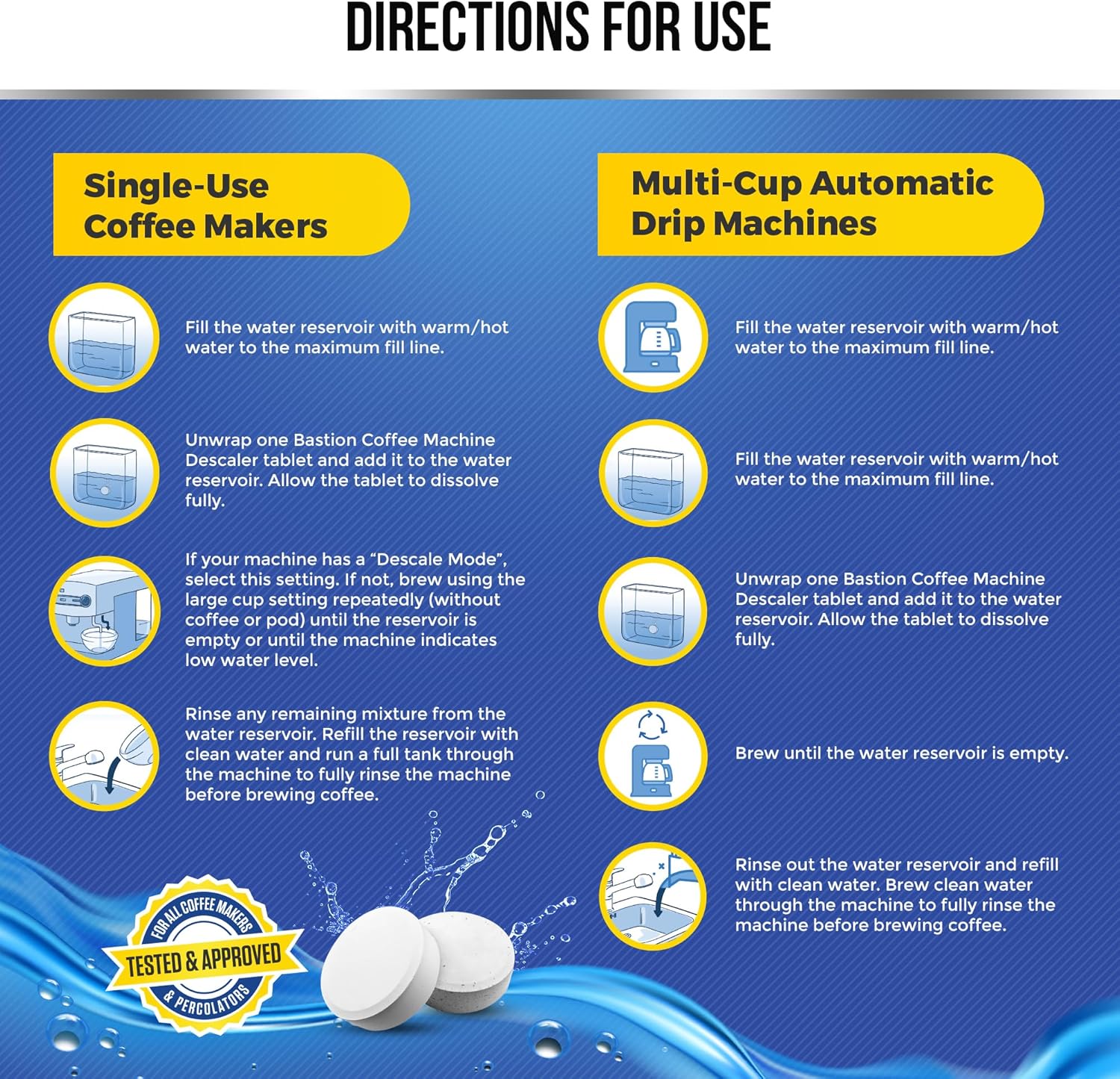 • Professional-Grade Results at Home: Skip the hassle of expensive professional cleanings or replacement parts. Bastion’s descaler tablets are designed to deliver the same results as professional-grade cleaning solutions, but at a fraction of the cost. Enjoy the satisfaction of a perfectly maintained coffee maker without leaving your home, and take control of your machine’s health with confidence.