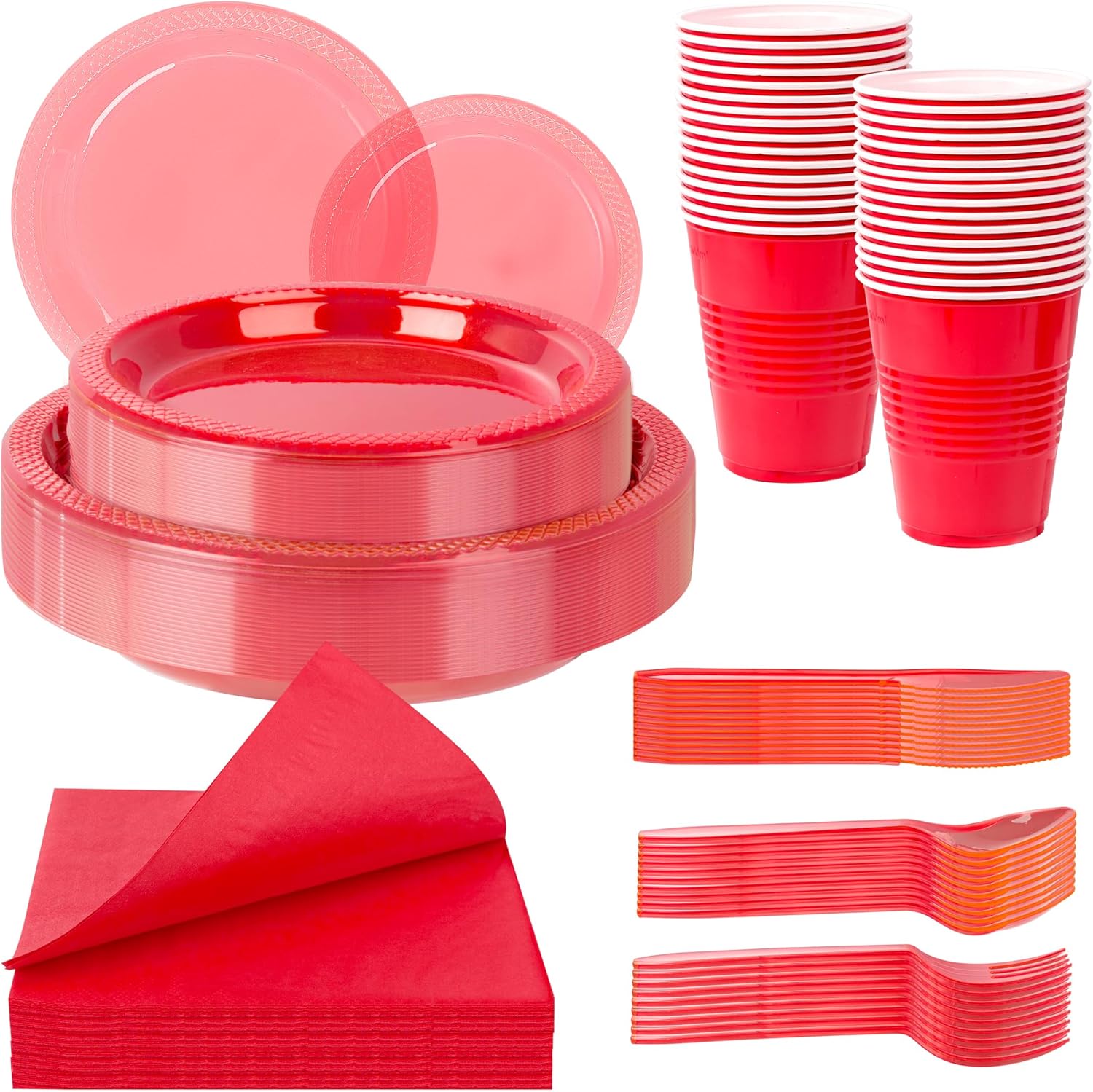 • 【Healthy Material】Our clear red disposable dinnerware set is made of strong and healthy material, which is suitable for all kinds of food, durable and safe enough for your guests