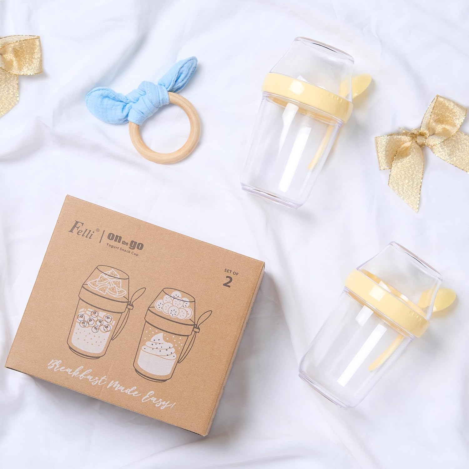 Felli On The Go Yogurt Parfait Snack Cup with Lid, Reusable Leak Proof Acrylic Travel Container for To Go Cereal Granola Milk, 12 oz Clear Mason Jar with Spoon & Crunch Fruit Holder (2, Yellow)