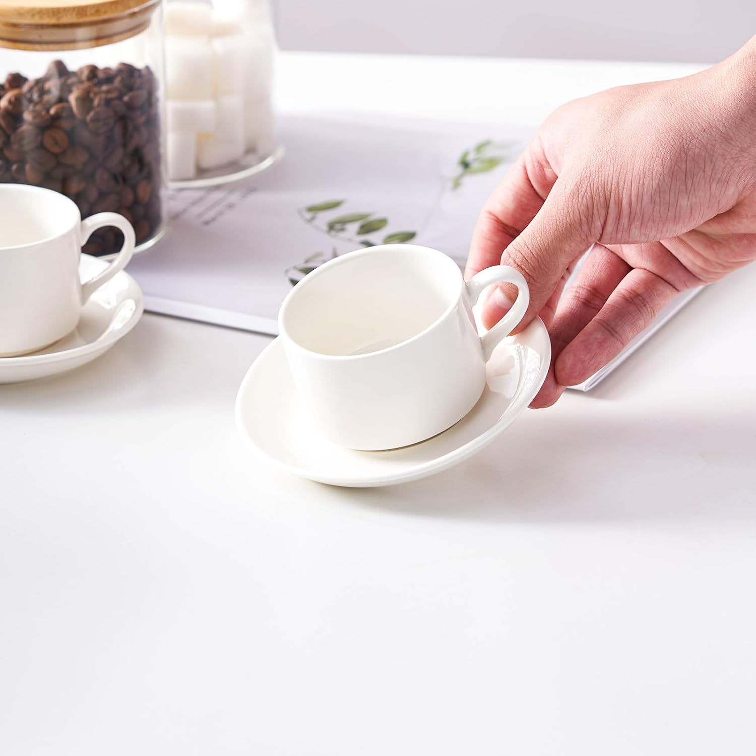 • 1. Elevate your kitchen experience with the MEICHU Espresso Cups Set. This set includes 4pcs 4 Ounce Espresso Cups with Saucers and Metal Stand, all in a classic ceramic white color. Perfect for people who enjoy coffee and conversation!