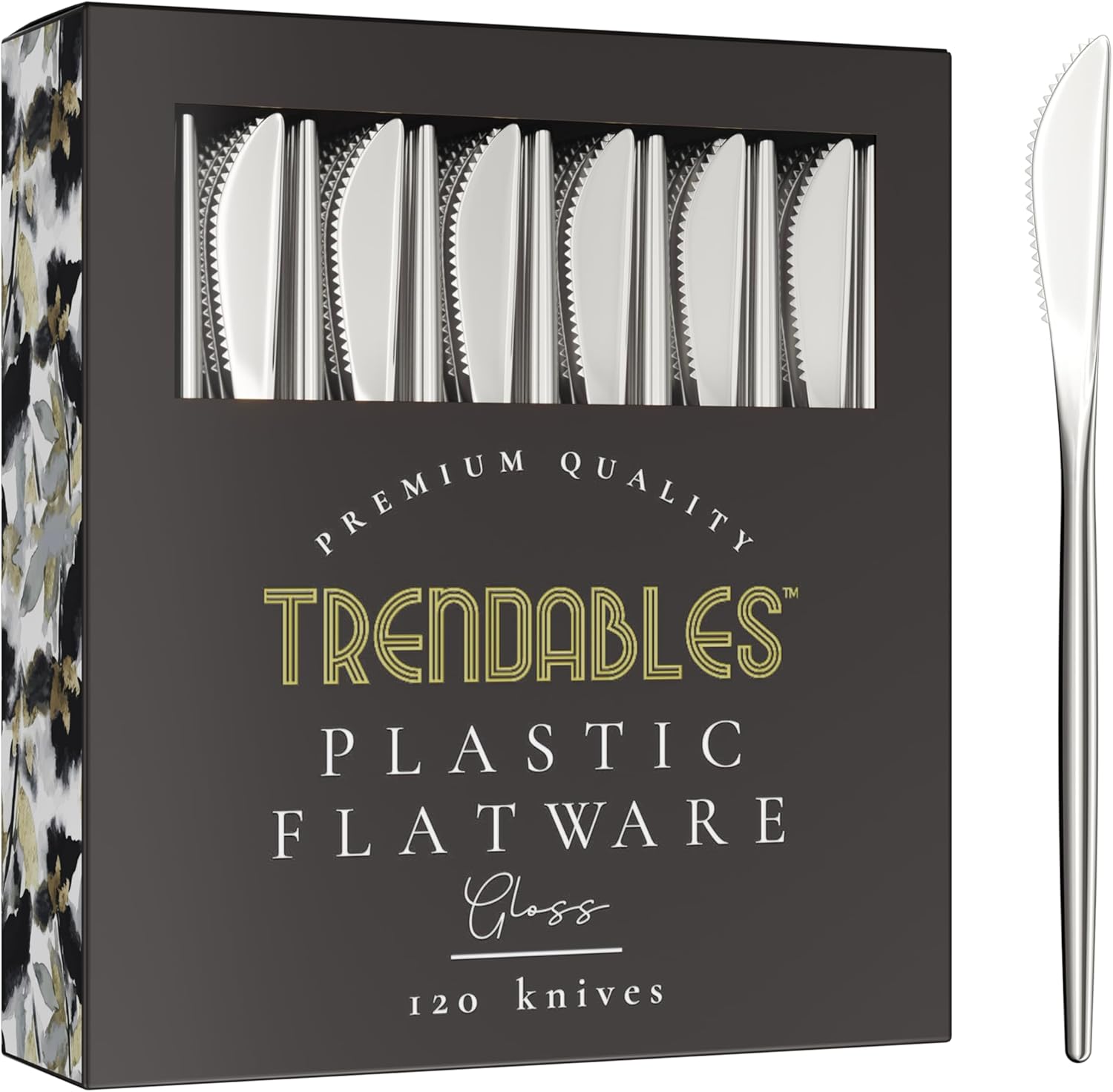 Trendables Disposable Silverware - 120 Pack Plastic Cutlery Set With Knives, Beautiful Silver Plastic Utensils