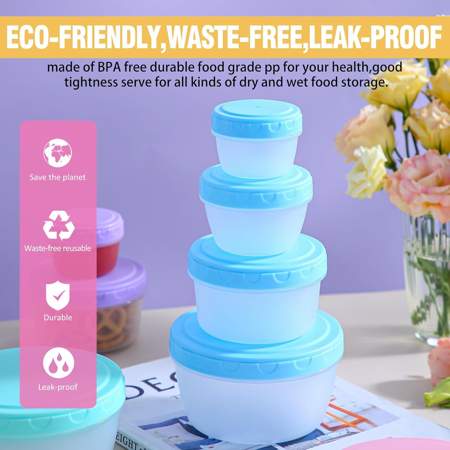 • What You Get: You can get 16 Pcs food storage containers with lids of four sizes-4 Pcs 20oz, 4 Pcs 10oz, 4 Pcs 5oz, 4 Pcs 2.5 oz . The 20oz bowls with lids can serve as deli, lunch, soups, leftovers, purees and homemade drinks, the 10oz food storage container can serve as fruit, salads, ice cream storage containers for fridge,the 5oz and 2.5oz food container can serve as salad dressing container, sauce containers, dip containers and condiment containers for lunches