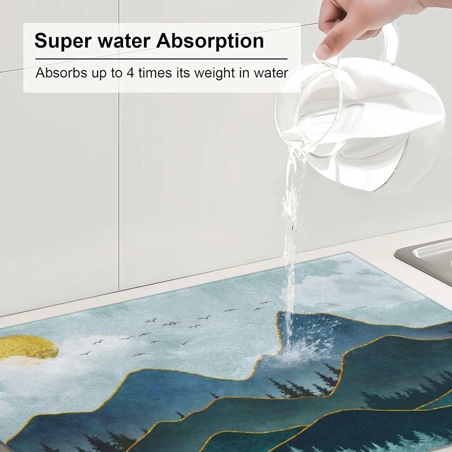 • Kitchen drying mat made of absorbing microfiber, and the middle is made of composite sponge, soft absorbent, non-slip, reversible, reusable