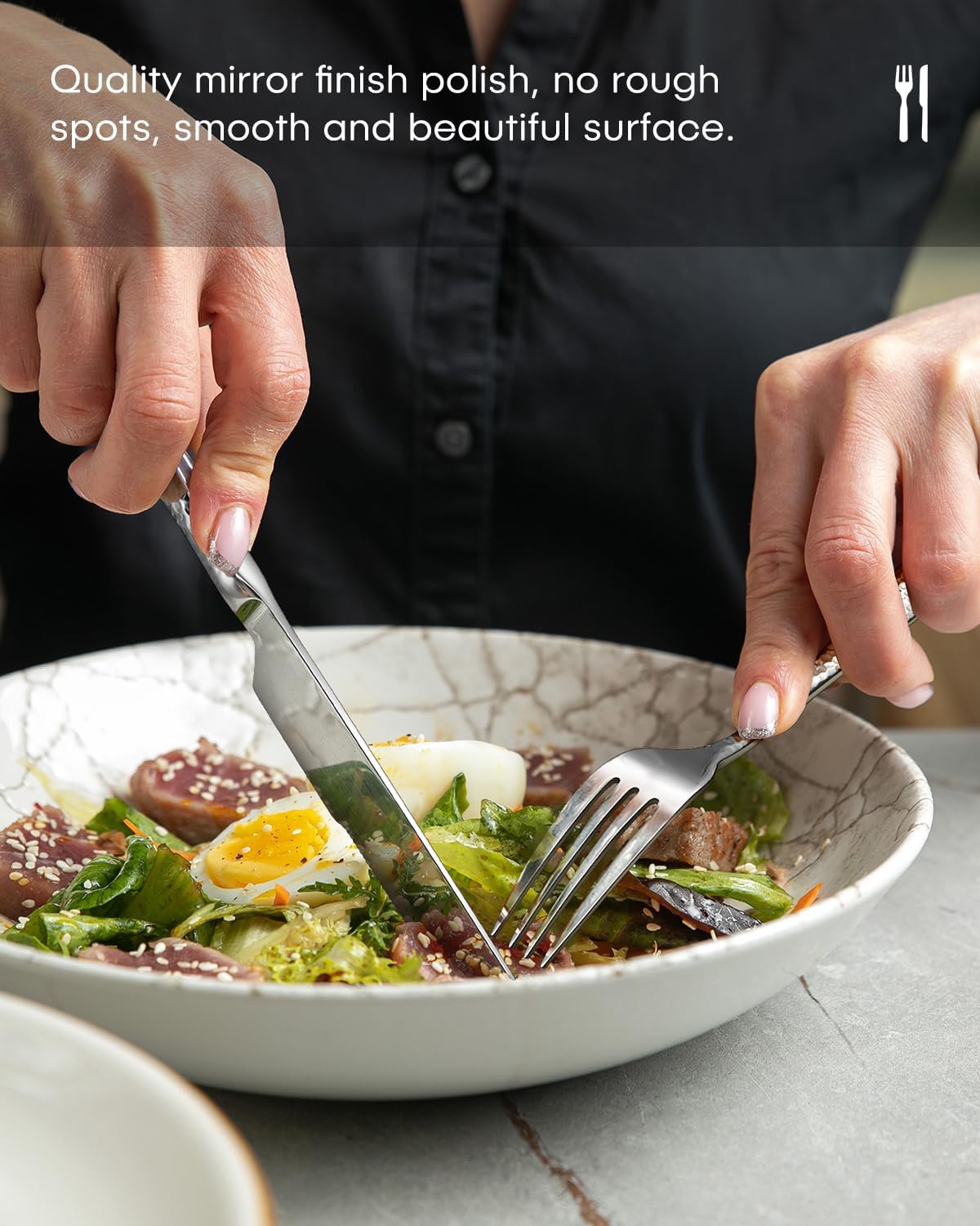 • Heavy-Duty And Ergonomic Design: Our utensil Set design with ergonomics in mind, uses thickened food-grade superior sturdy stainless steel that offers durability, while exceptional balance weight to a comfortable grip. Easy enjoyable meals without worry!