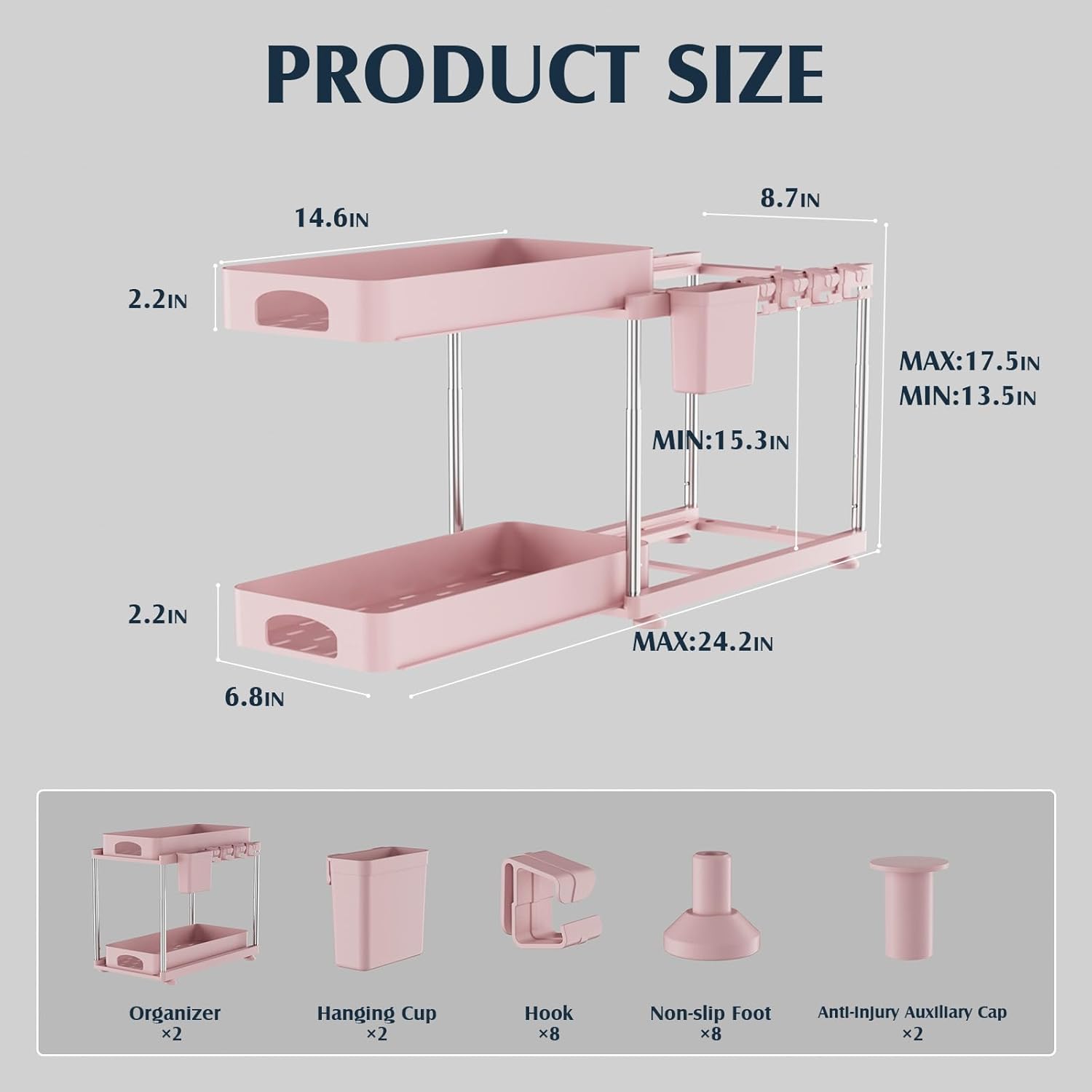 Under Sink Organizer, 2 Pack Kitchen and Bathroom Cabinet Organizer, 2 Tier Adjustable Height Storage, Pink