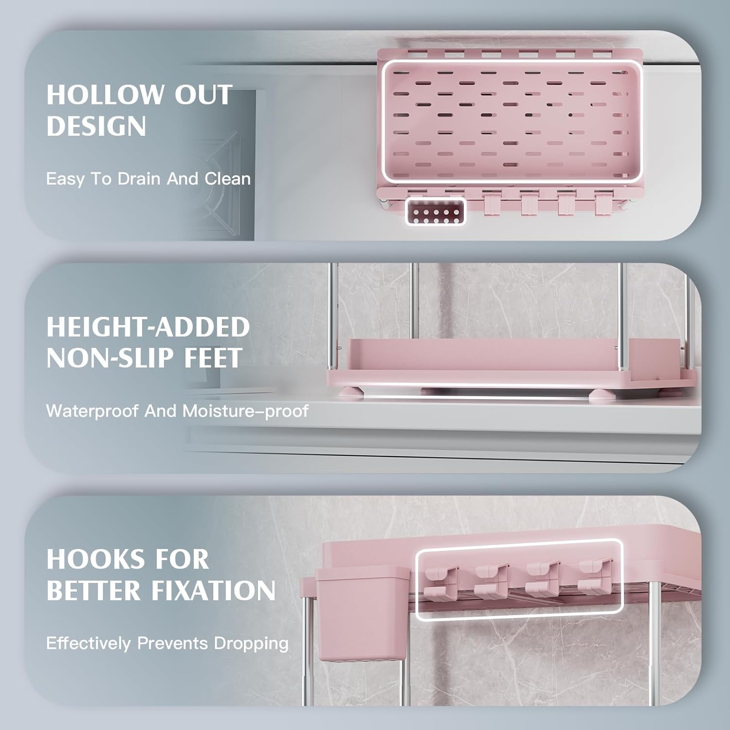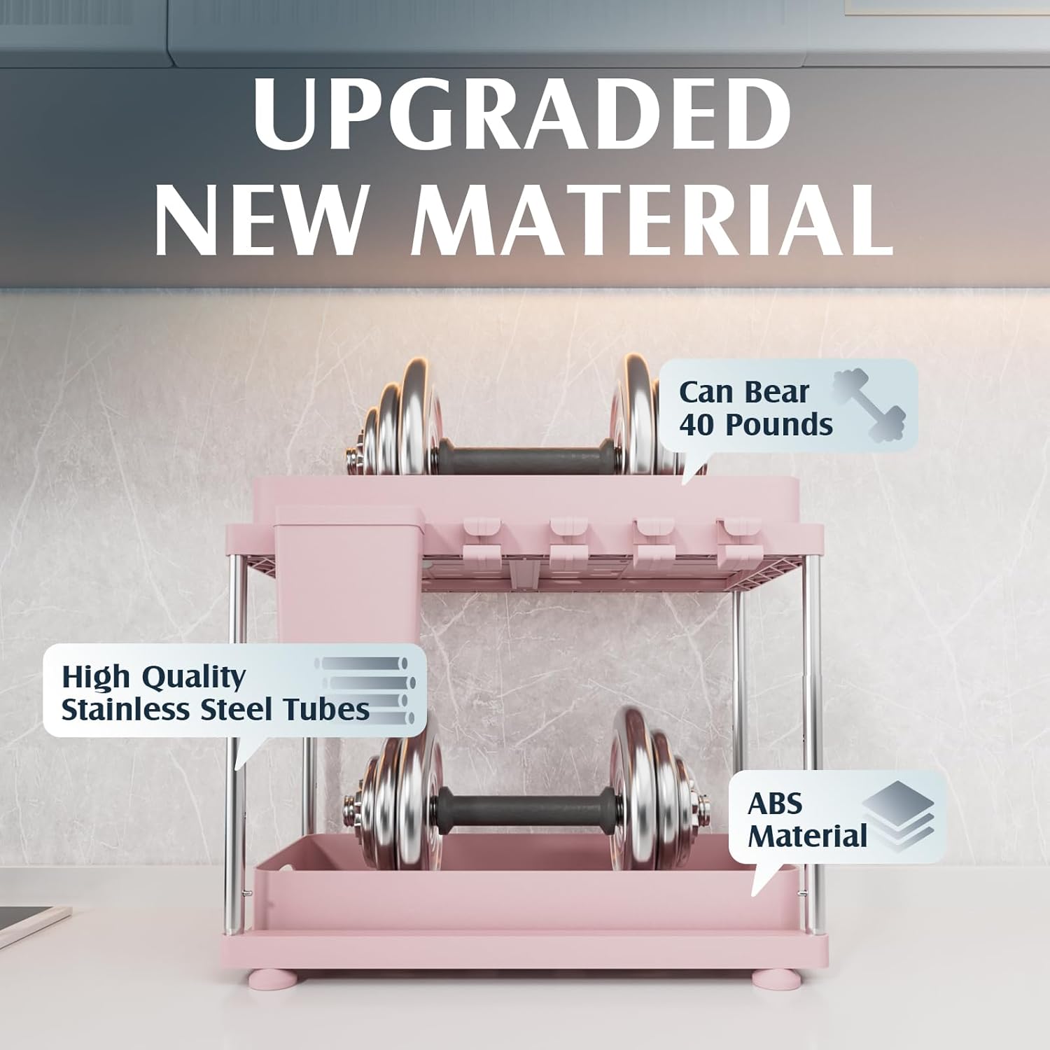 • Upgraded ABS Material:The under kitchen sink organizer is made of thickened ABS, which is more stable and load-bearing than ordinary plastic. The support tubing consists of stainless steel tubing, which prevents rusting due to moisture while ensuring load bearing.