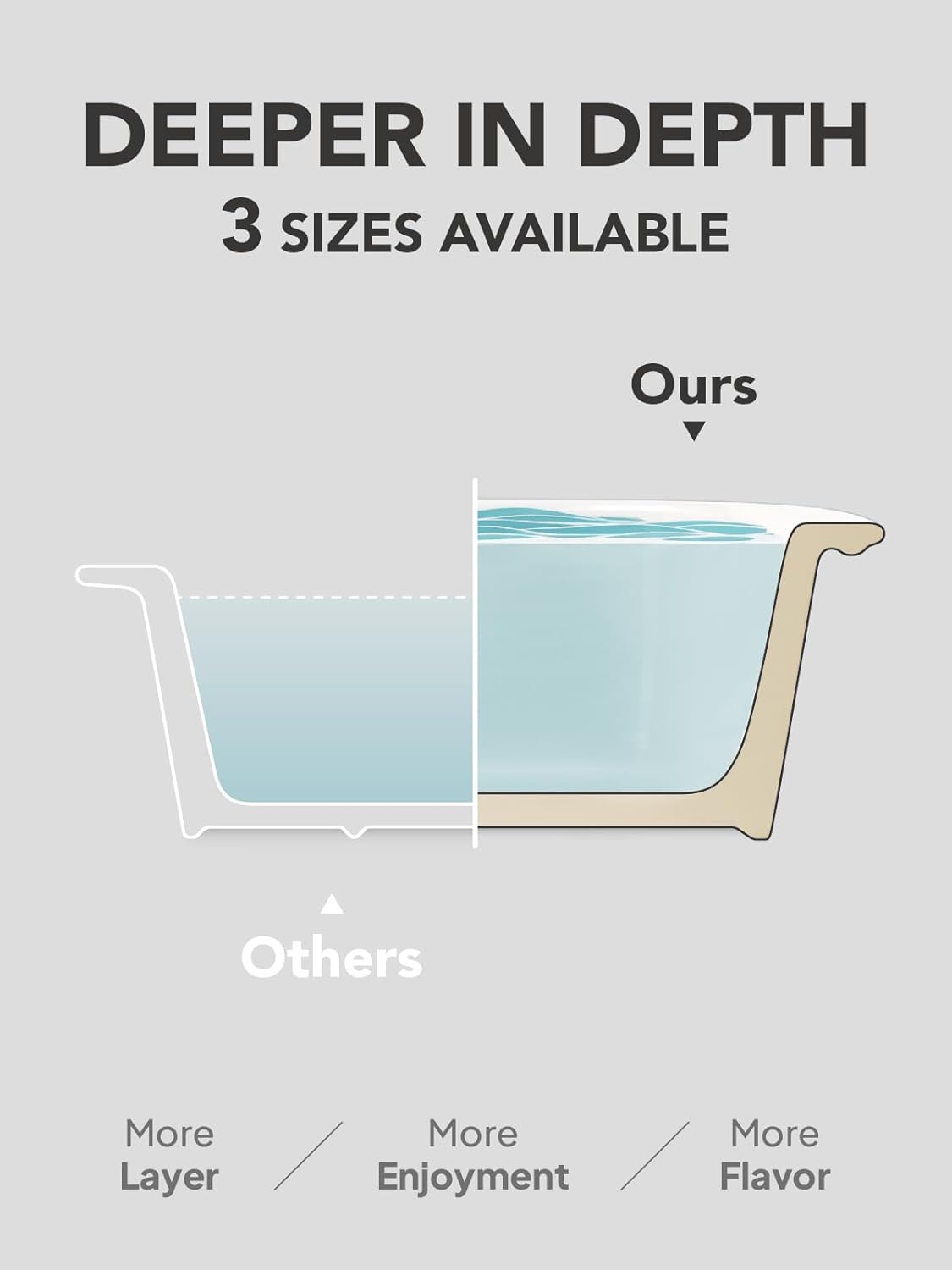 • Extra Deep for More Flavor: This 3-piece casserole dishes for oven set includes large (13.7” x 9.6” x 3.0”), medium (11.1” x 8.3” x 2.8”), and small (8.3” x 6.6” x 2.6”) pans. Each pan is deep, making them perfect for a wide variety of dishes—from layered casseroles and lasagnas to roasted meats, as well as family-sized or small-batch recipes