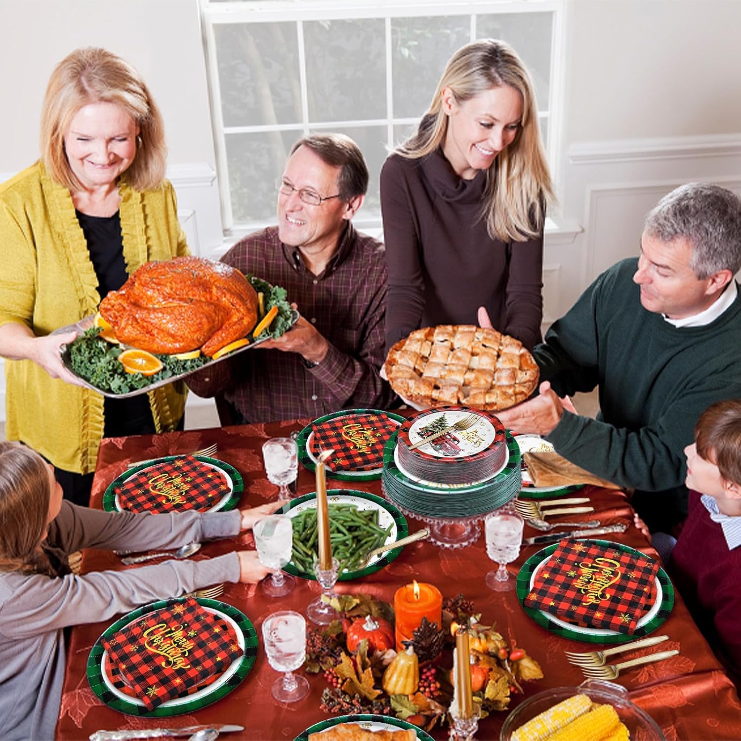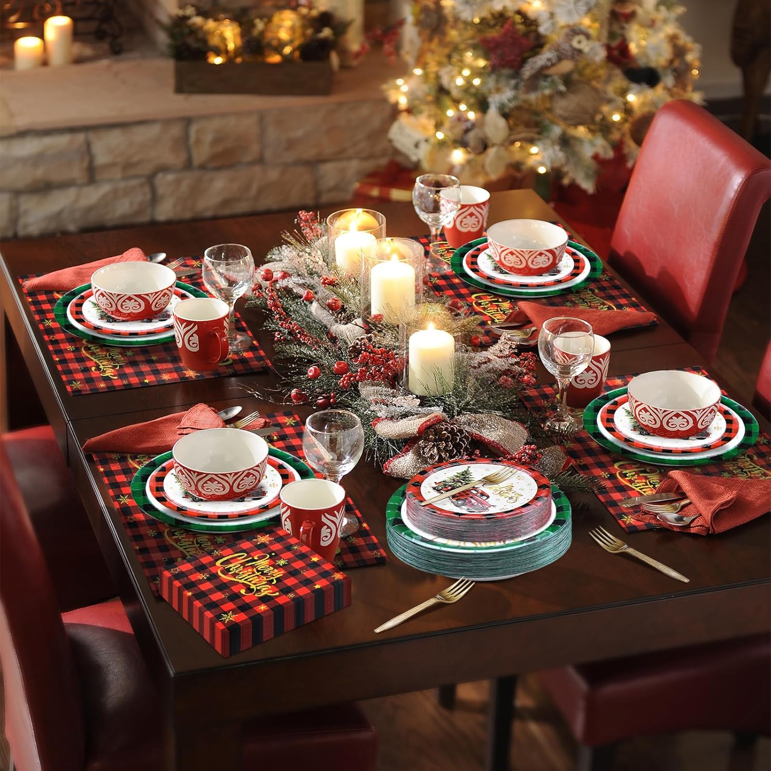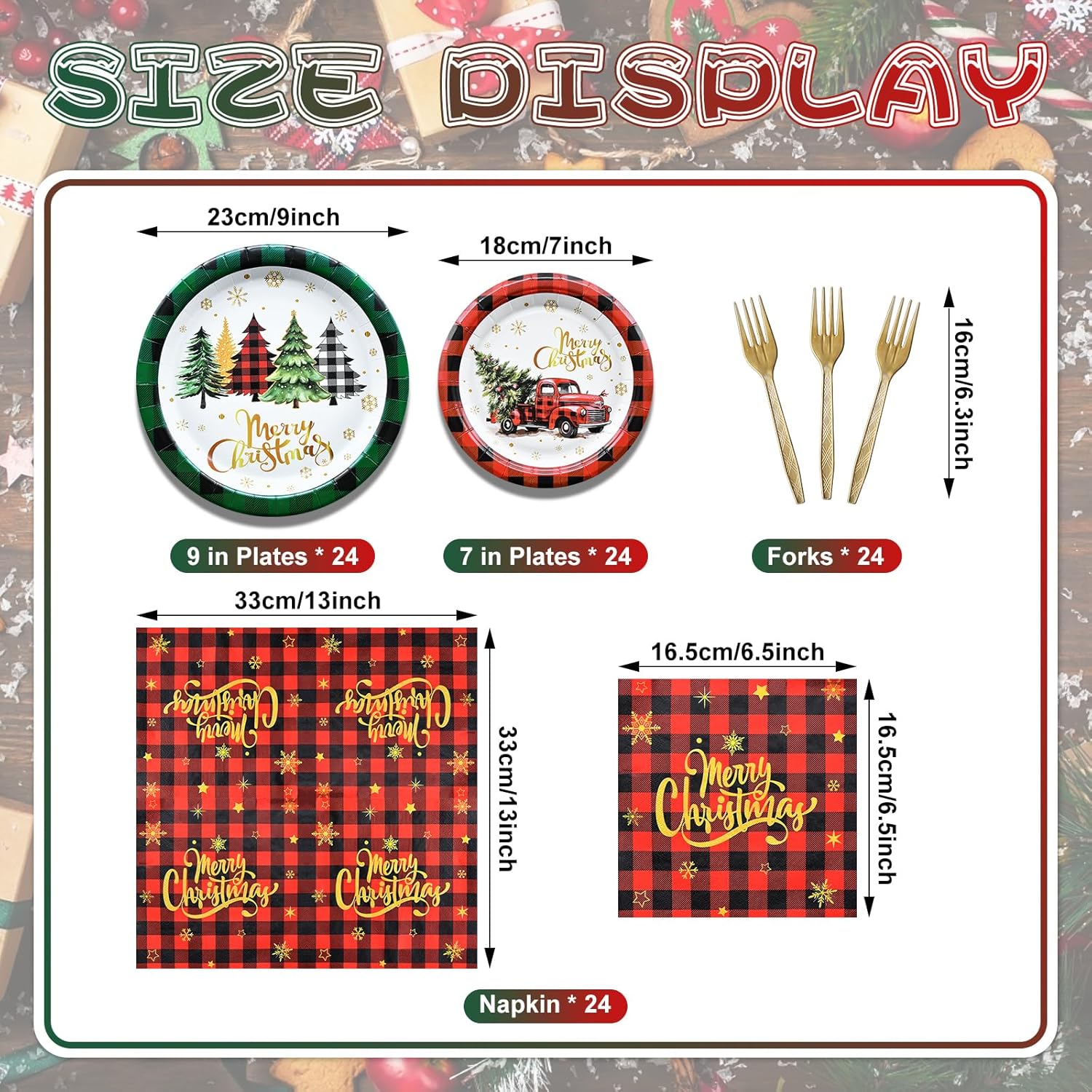 • Comprehensive Party Pack - This 96-piece set is designed to serve up to 24 guests and includes 24 large 9-inch plates, 24 smaller 7-inch plates for desserts, 24 napkins, and 24 matching plastic forks. It provides all the essentials for a well-coordinated and festive Christmas celebration.