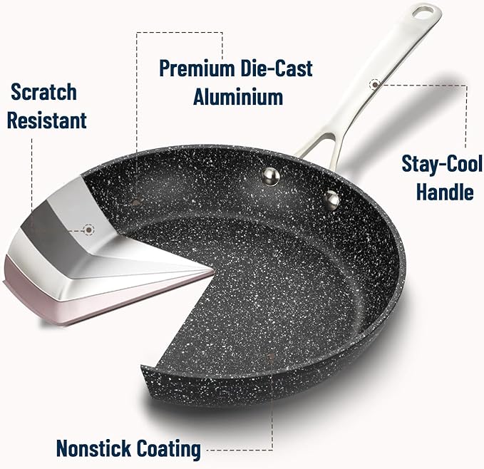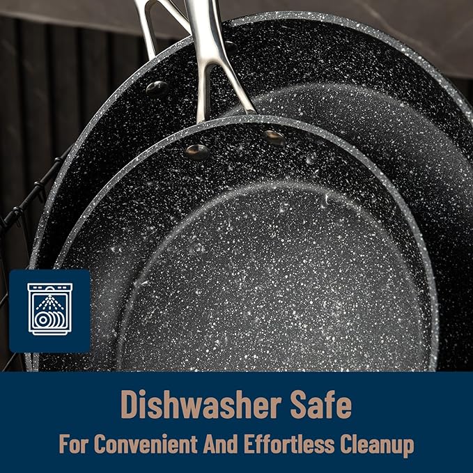 • Versatile Sizes: The 2 piece frying pan set includes an 9.5-inch and 12-inch cookware set, These sizes are perfect for cooking a variety of dishes, from individual portions to family portions
