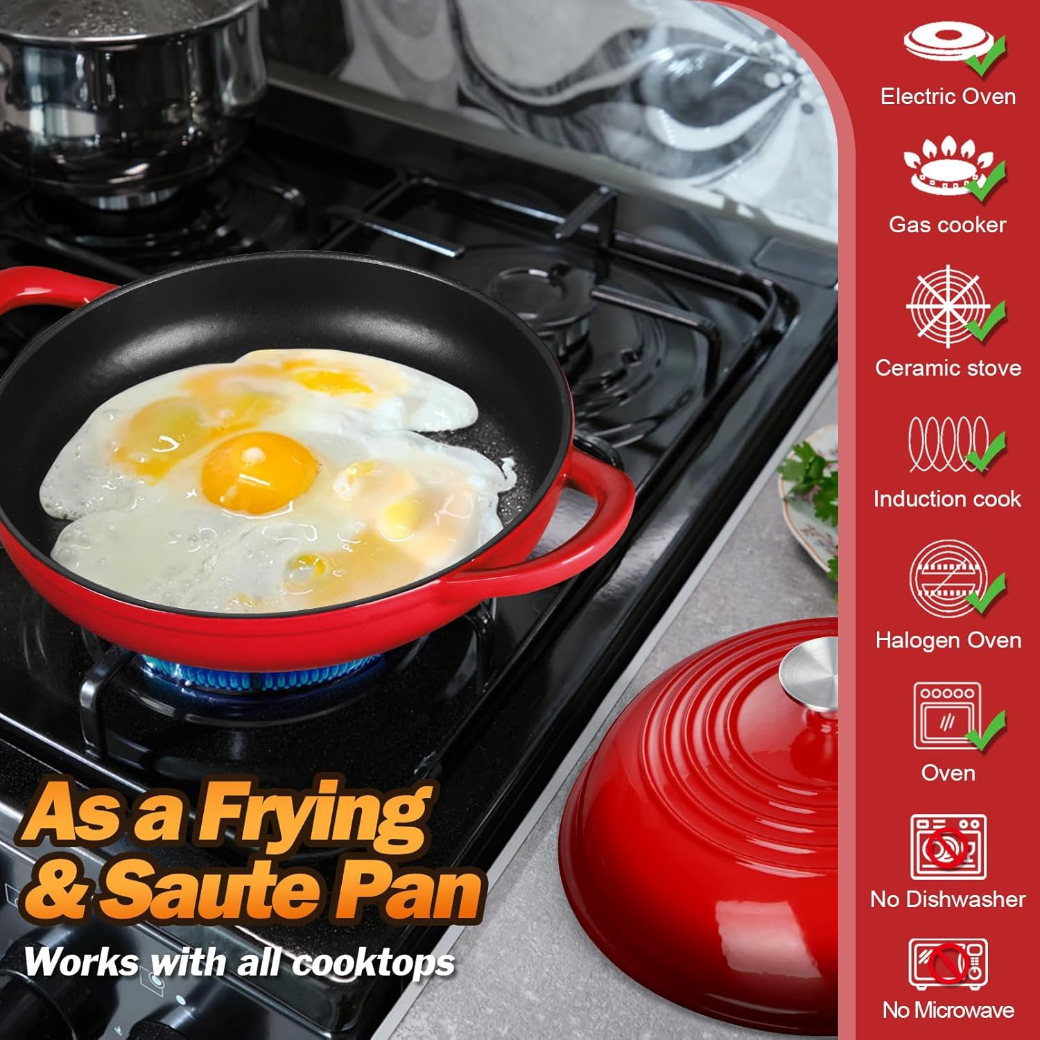 • 【Practical & Exquisite】Red dutch oven construction with 4 mm thickness for long-lasting use for years, Bread oven pot can work on all stoves, such as electric, gas, ceramic, induction or halogen cooktops, The shallow bread pan also can be a saute pan and a skillet pan for small batch of food cooking and frying, 3-layer red enamel coatings exterior is bright and elegant to catch your eyes and decorate your kitchen easily, Match well with different kitchen styles