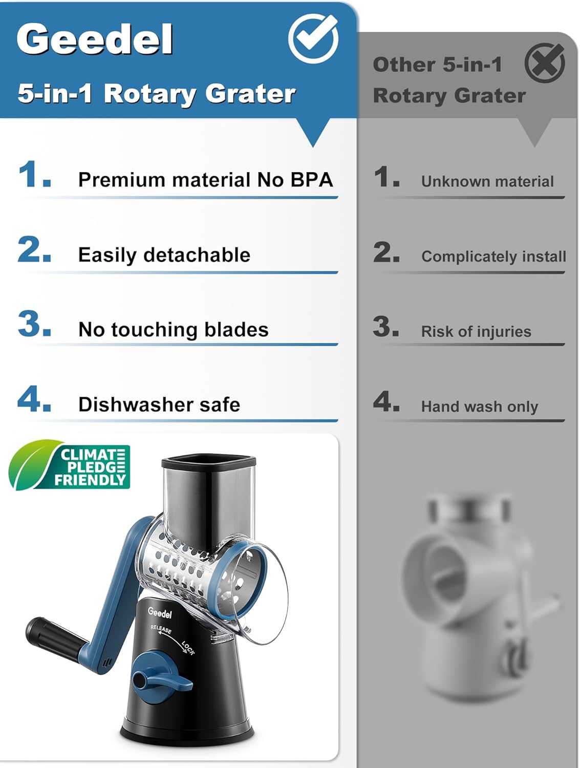 • Newly Upgraded : Compared to original three blades, we added two new sharper blades : a crushing blade and an extra fine shredding blade to meet more needs. Plus, the knob on the original cheese grater has been upgraded to lock mechanism with simple grip