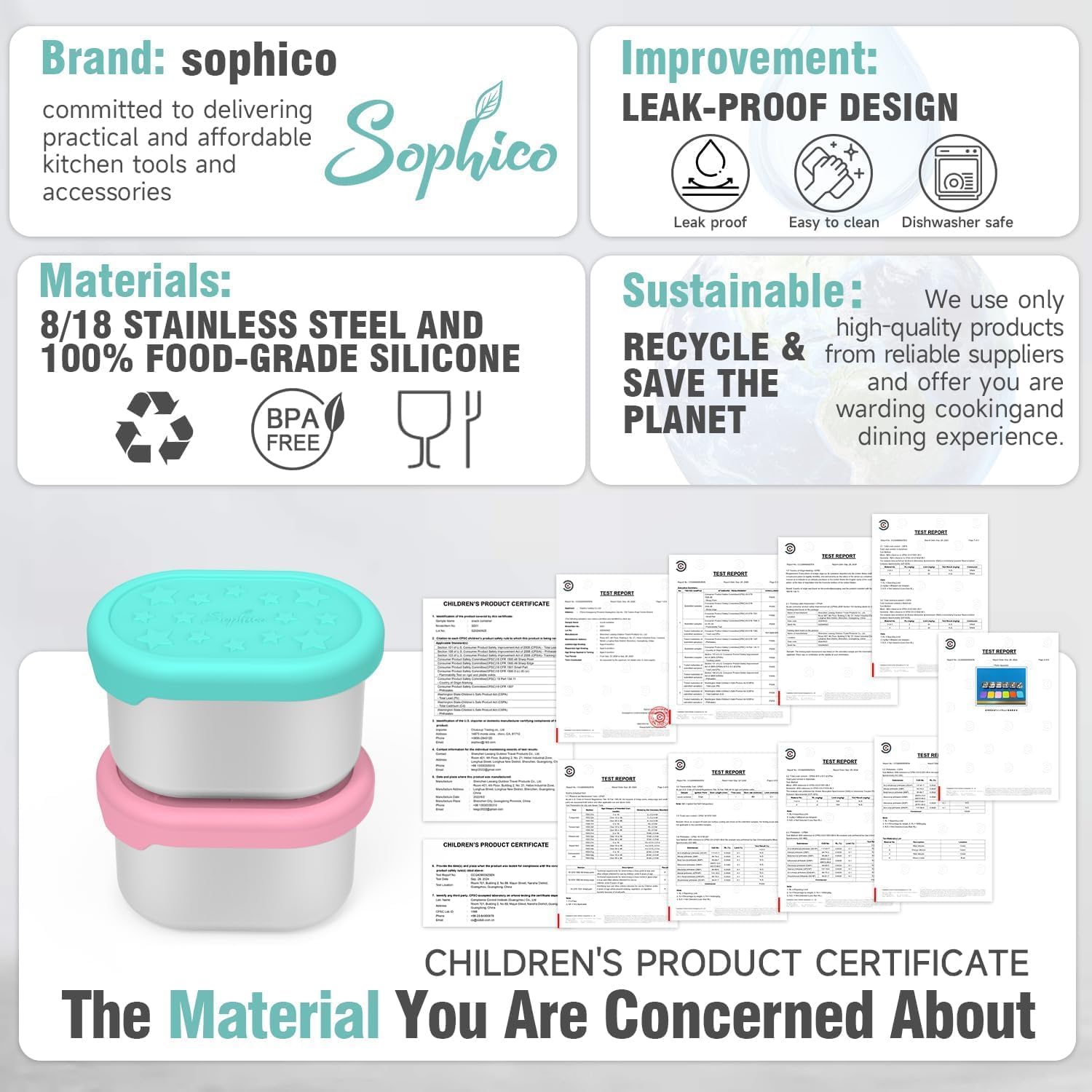 • Food-Grade Material: SOPHICO stainless steel snack containers are made from high-quality 18/8 stainless steel and 100% food-grade silicone. To ensure the standard of our products, the containers comply with CPSC standard by a series of tests. CPSC certified BPA free and non-toxic. Safe, durable and eco-friendly, you can use it without worry.