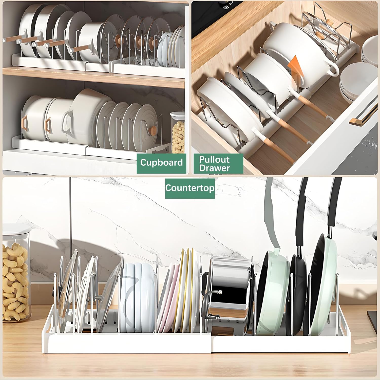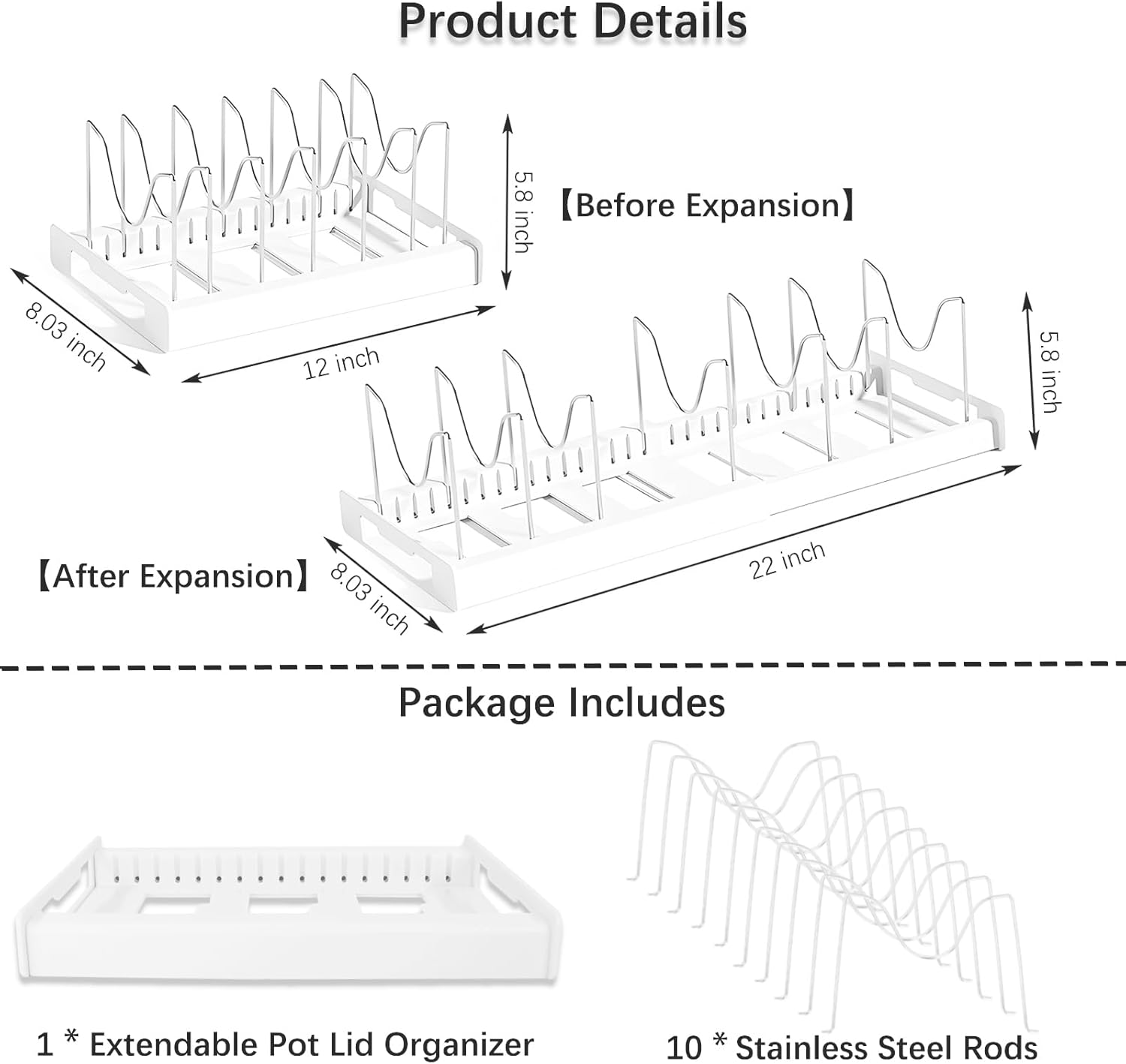 • EXTENDABLE POT LID ORGANIZER - The pot organizers inside cabinet expands from 12''-22'' wide to maximize you can set this pan organizers inside cabinet to the size you want space in any cabinet