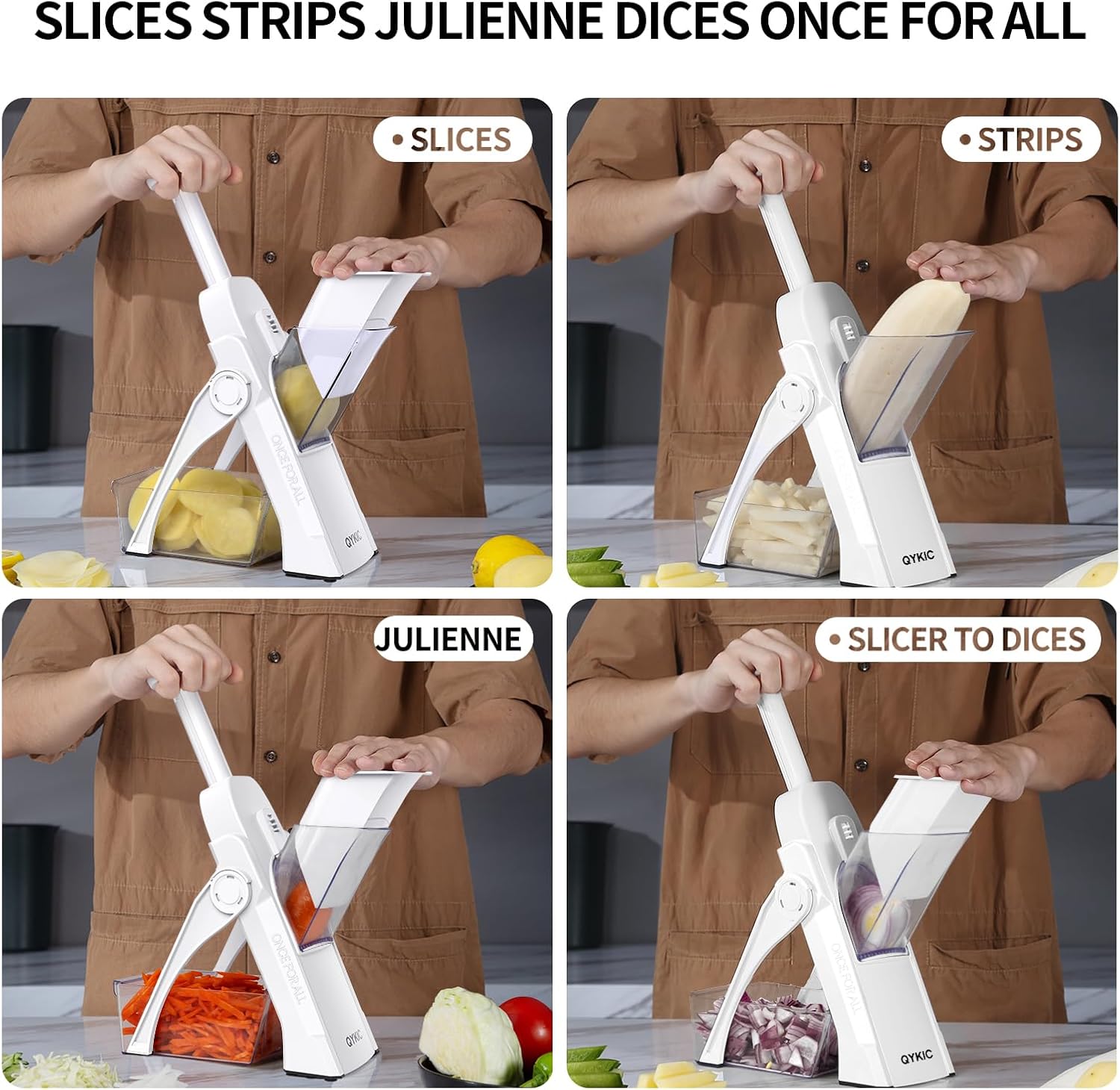 • SAFETY MANDOLINE SLICER: This mandoline slicer whit build-in blades design, no need to touching blades,safe & quickly slicing vegetable & fruits, easy to set up and clean up.Quickly prepare potato slices, lemon onion slices, cucumber slices, carrot slices, etc, which makes your kitchen work simple and efficient.