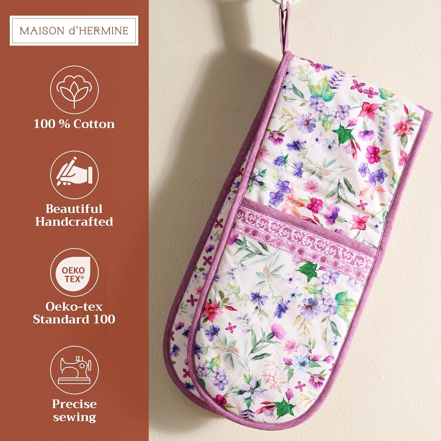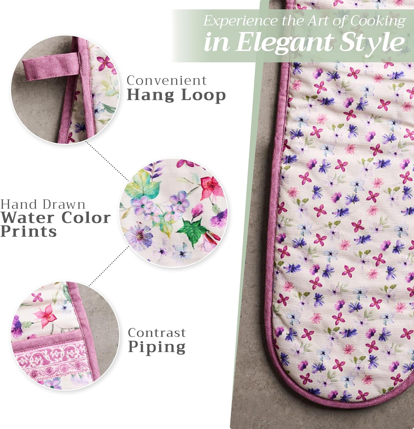 • Package includes: Includes 1 double oven mitt sized 7"x35". Perfect for handling hot cookware safely while adding a touch of European elegance to your kitchen. Designed in Europe and made in India with care