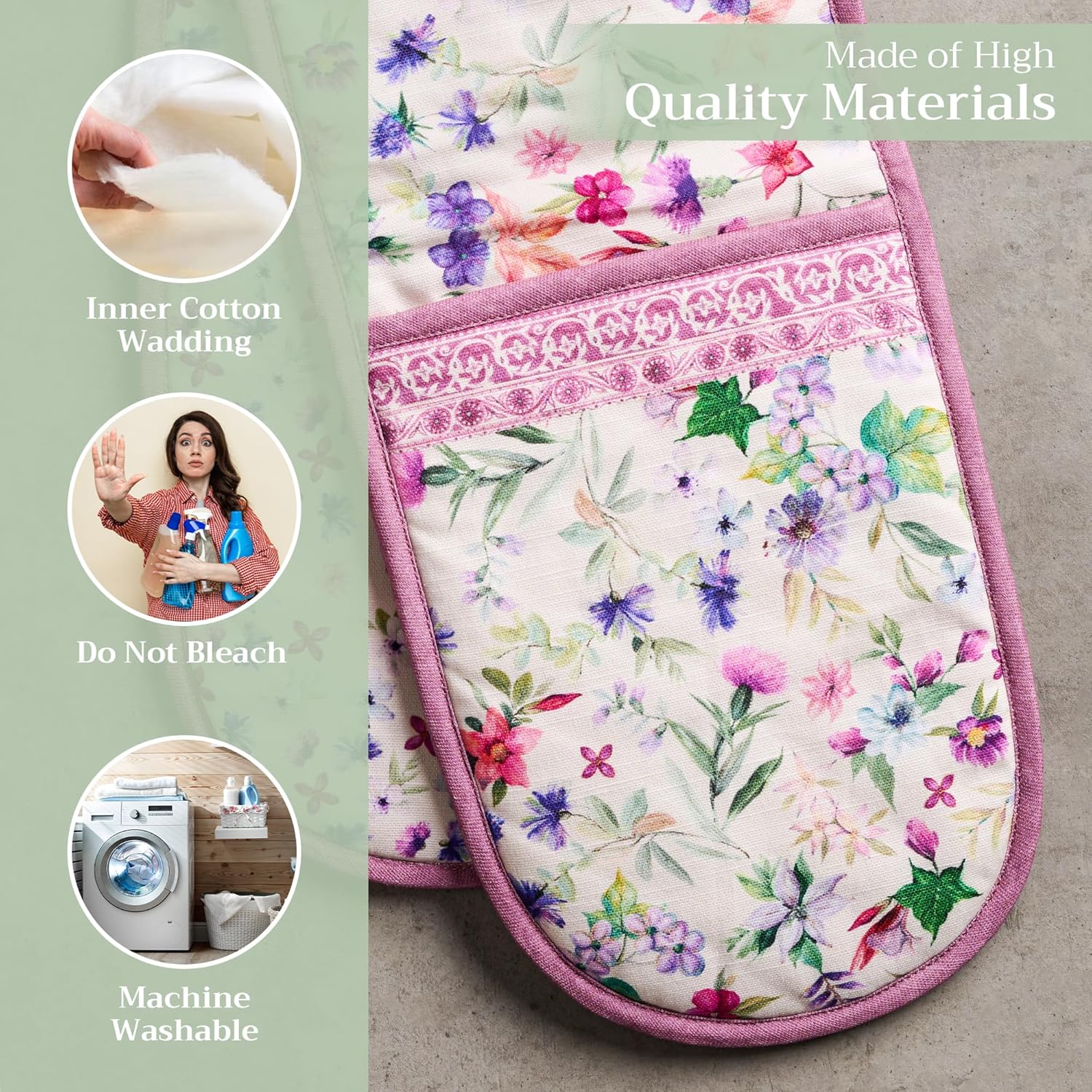 • 100% Quilted cotton: Crafted from premium quilted cotton for superior heat resistance and durability. This double oven mitt offers a soft, flexible grip and protects your hands during baking, roasting, or grilling