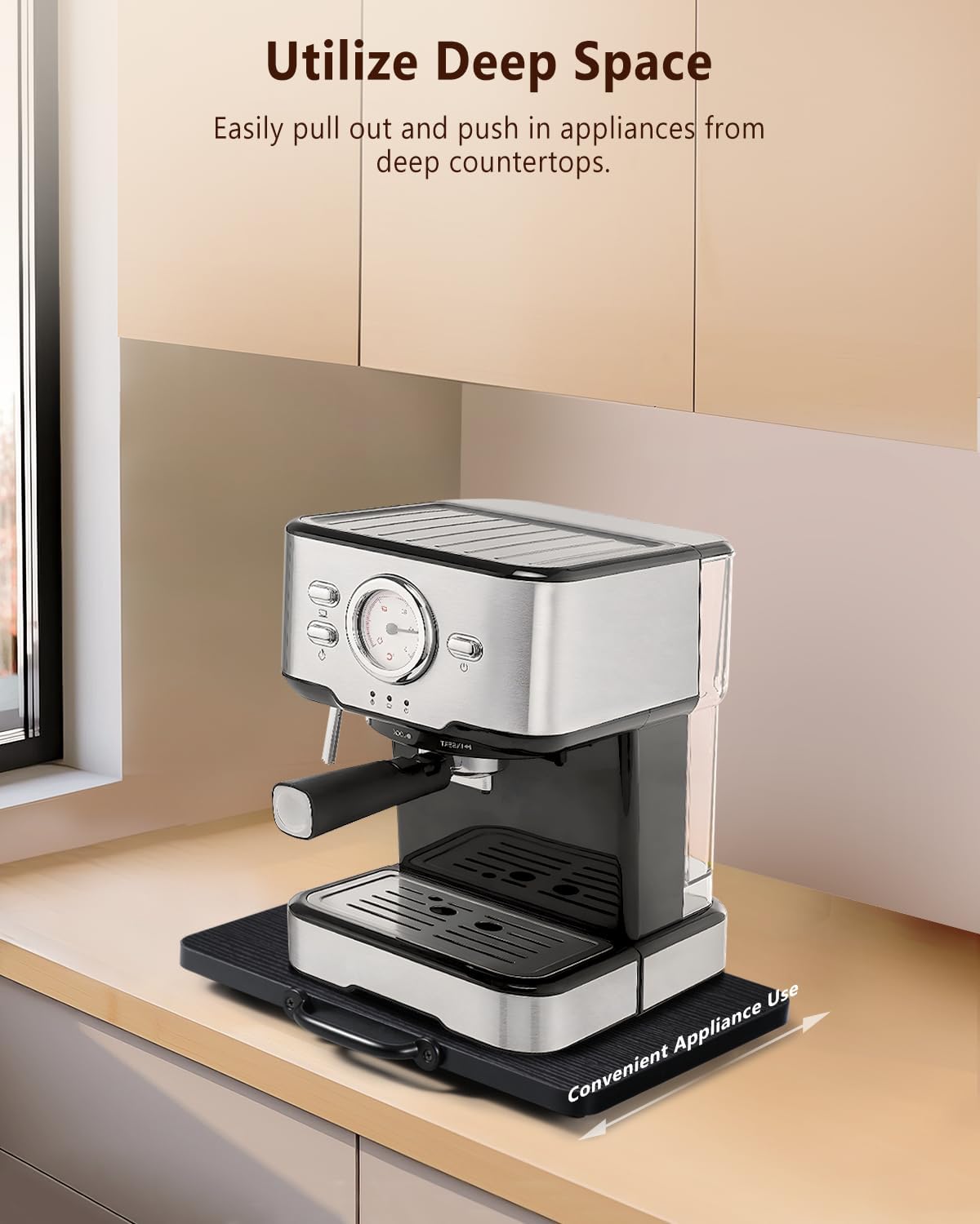 • Long-lasting & Sturdy: Our Appliance Tray supports up to 40 lb; it’s a sliding coffee tray for countertop that blends with any decor; a durable coffee slider for countertop, combining strength and style for your kitchen or dining area
