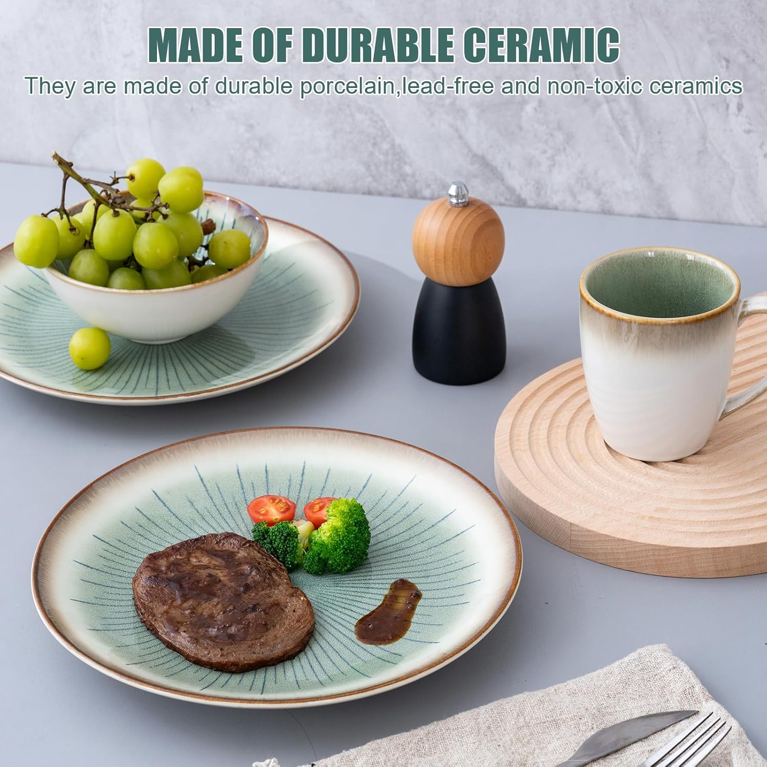 • [Premium Material&Design]: Our plate and bowl sets are made from natural stoneware, and fire the glaze at high temperature. The glazes are food-grade, 100% lead-free, and cadmium-free, so you don't have to worry about health issues, use classic green line design, beautiful and generous, the surfaces of plates and bowls have a unique touch, giving you the perfect dining experience.
