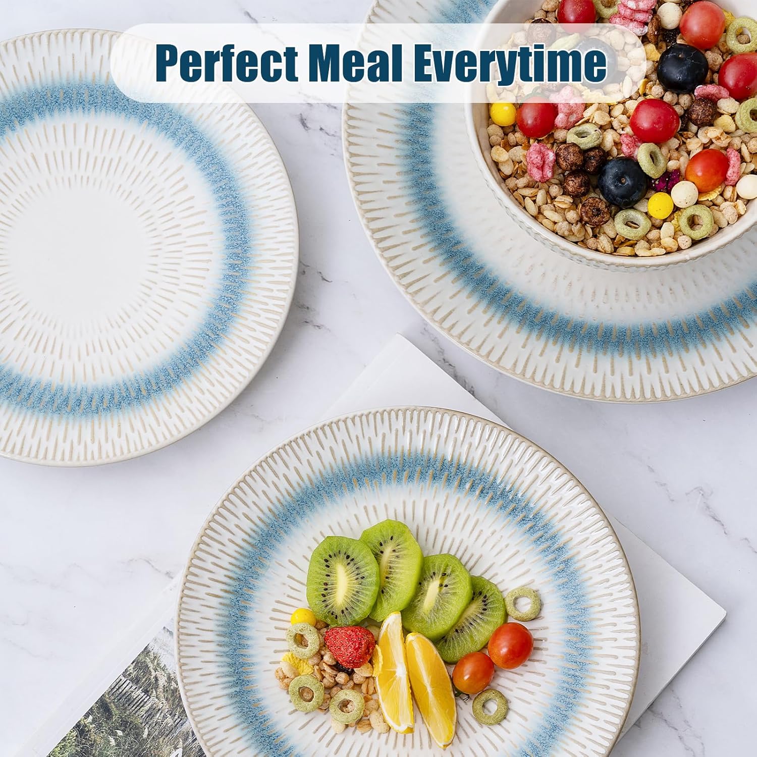 • [Premium Material&Design]: Our plate and bowl sets are made from natural stoneware, and fire the glaze at high temperature. The glazes are food-grade, 100% lead-free, and cadmium-free, so you don't have to worry about health issues, use classic blue relievo design, beautiful and generous, the surfaces of plates and bowls have a unique touch, giving you the perfect dining experience.
