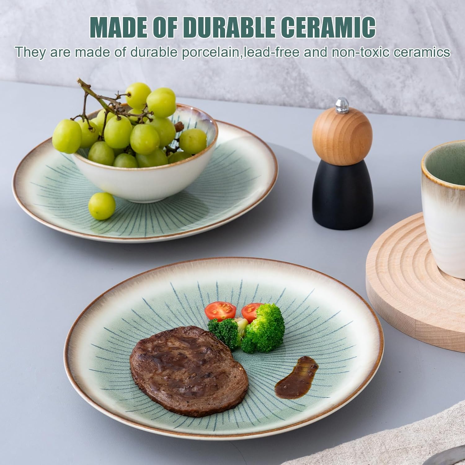 • [Premium Material&Design]: Our plate and bowl sets are made from natural stoneware, and fire the glaze at high temperature. The glazes are food-grade, 100% lead-free, and cadmium-free, so you don't have to worry about health issues, use classic green line design, beautiful and generous, the surfaces of plates and bowls have a unique touch, giving you the perfect dining experience.