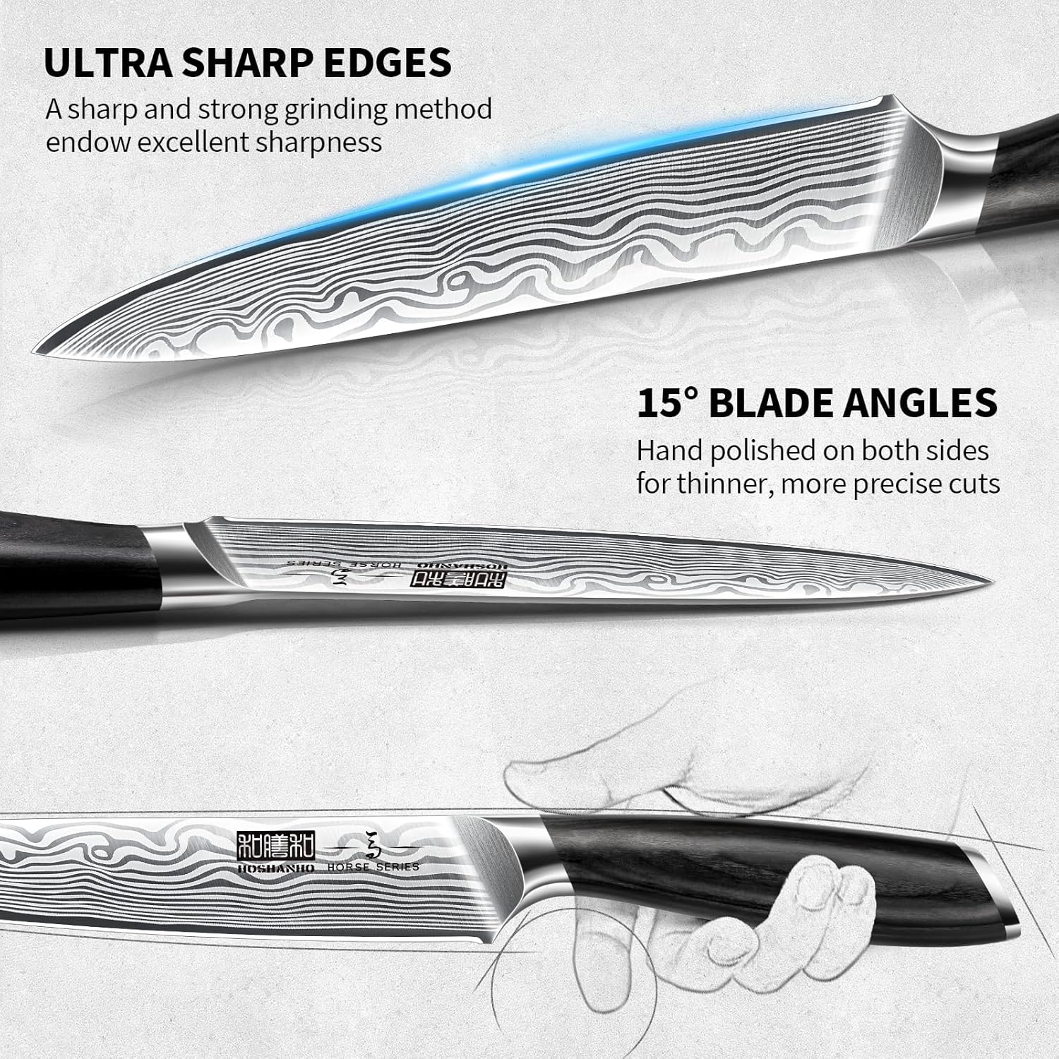 • 【High Carbon Stainless Steel Blades】Made from high carbon stainless steel and powder steel, our knife set has a high degree of hardness to resist wear and is easy to re-sharpen to a razor-like edge; This steel is not ordinary stainless steel, it's stabilized at 62 HRC
