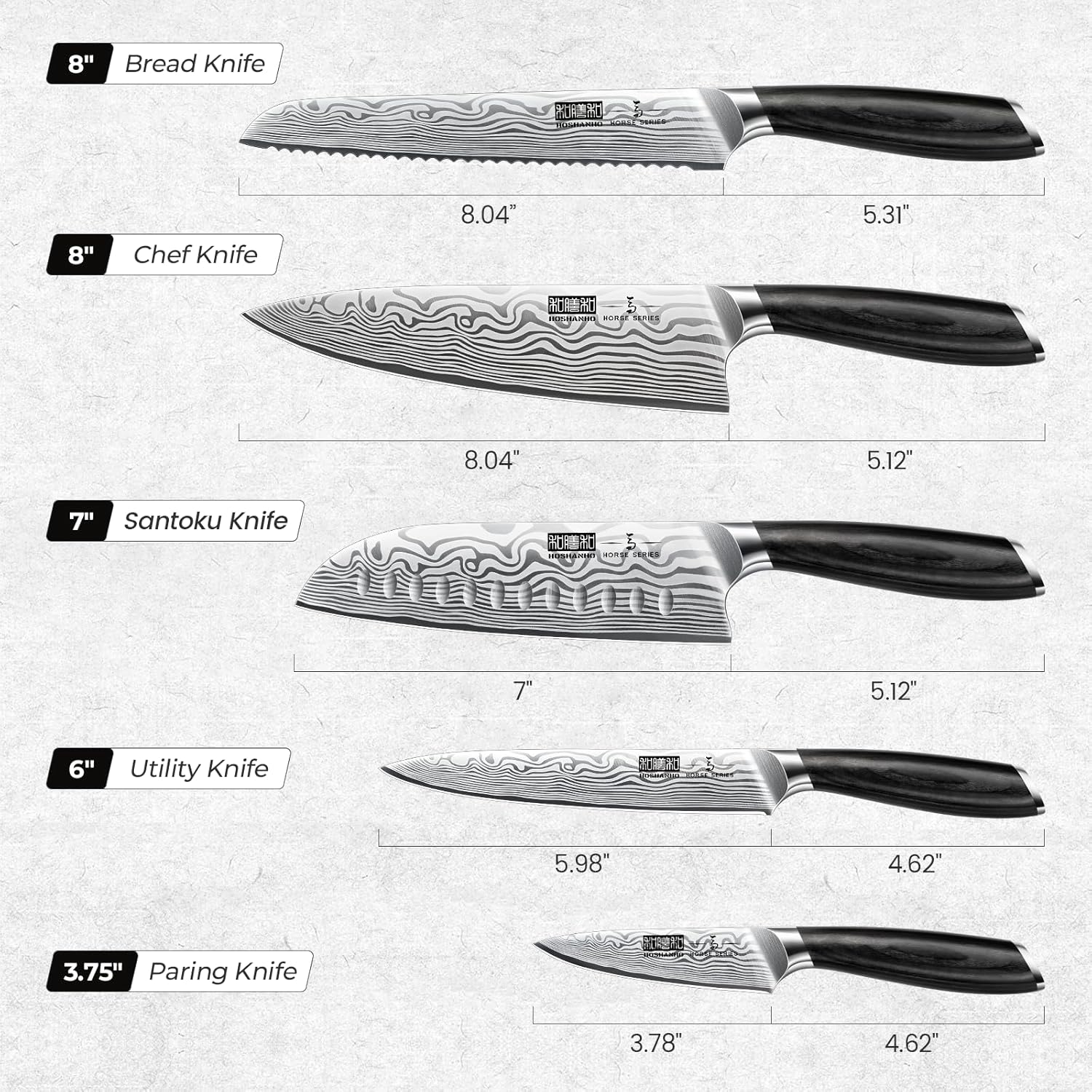 • 【Professional Kitchen Knives Set】5 pieces knife set includes: 8" chef knife, 8" serrated bread knife, 7" santoku knife, 6" utility knife, 3.75" paring knife; This set of knives can easily handle all kitchen tasks, such as cutting meat, fruits, vegetables, and breads