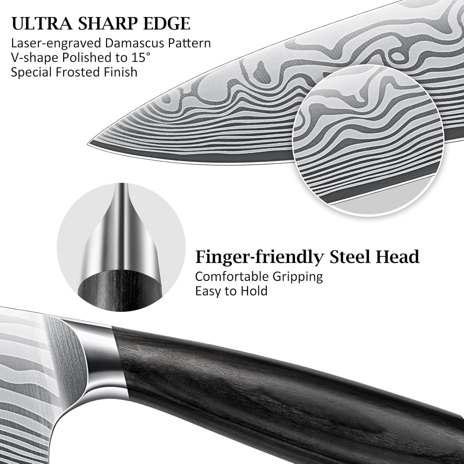 • 【Easy Cleaning & Convenient Storage】We recommend you to handwash the knife set to maintain sharpness and expand its service life; Coming with a wooden block, all knives can be stored safely and orderly. And the ventilated design is good for air circulation to keep knives dry; Note: This is not a Damascus Kitchen Knife Set