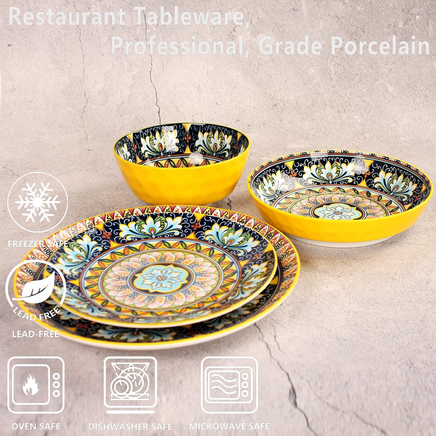 Mandala Dinnerware Sets, Plates and Bowls Set, Porcelain Dishes (16 Pieces) Service for 4, Zanzibar, Bohemian Style Dining Ware, for Kitchen and Dining Multicolor Dinnerware Set, Yellow