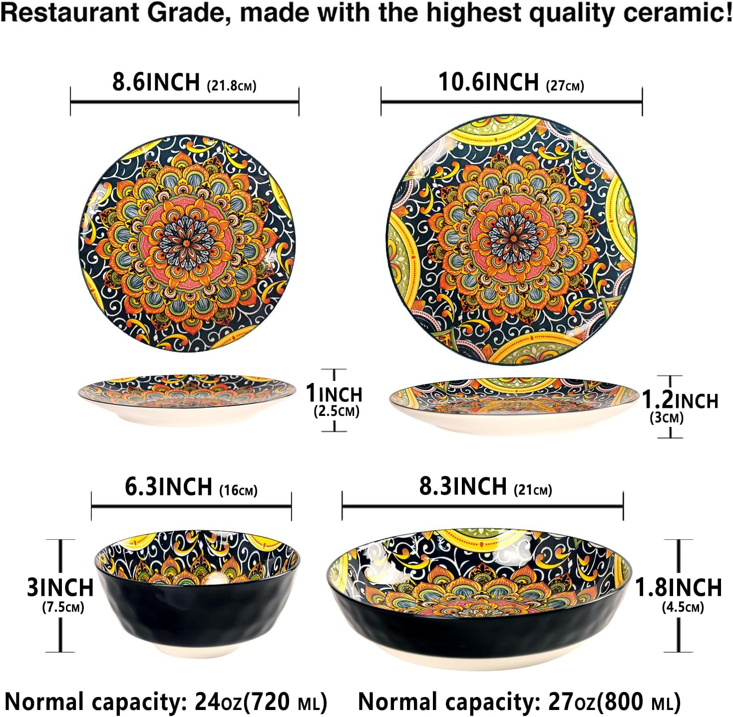 Mandala Dinnerware Sets, Plates and Bowls Set, Porcelain Dishes (16 Pieces) Service for 4, Zanzibar, Bohemian Style Dining Ware, for Kitchen and Dining Multicolor Dinnerware Set, Black