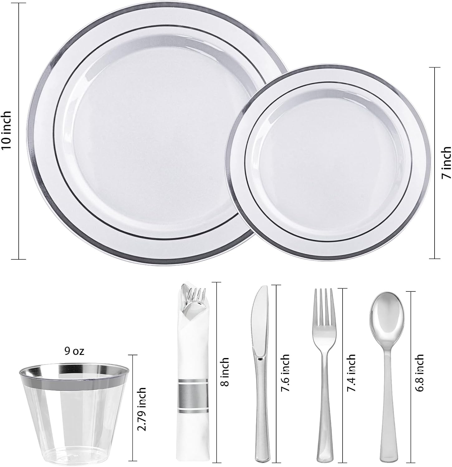 • All Occasions: The dinner plates and dessert plates are perfect for a range of events including weddings, birthdays, anniversaries and casual gatherings; the plastic silver silverware set is an ideal for various occasions