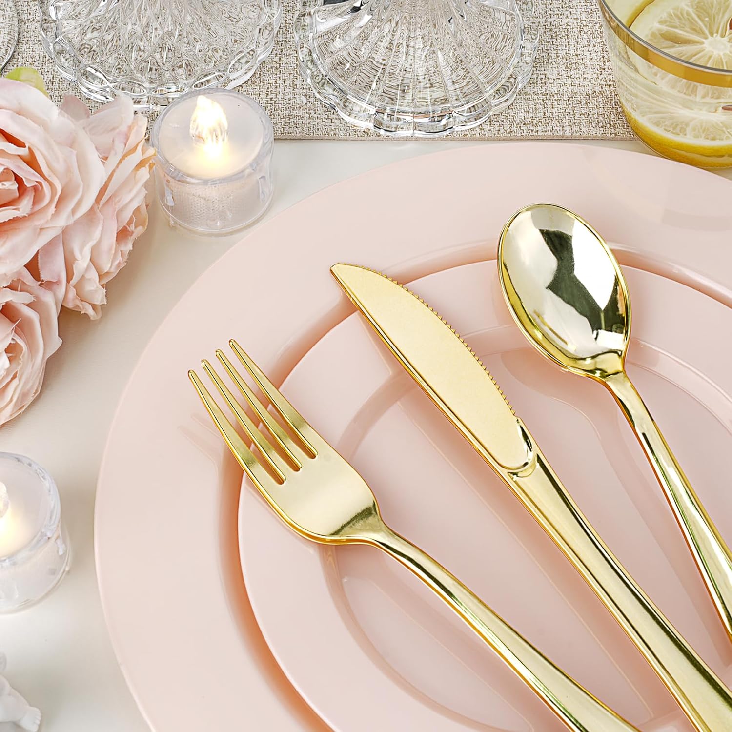 • All Occasions: The dinner plates and dessert plates are perfect for a range of events including valentines, weddings, birthdays, anniversaries and casual gatherings; the plastic gold silverware set is an ideal for various occasions