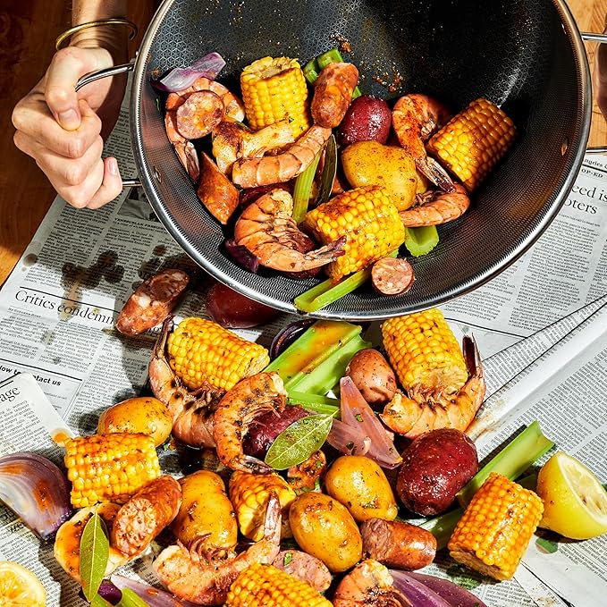 • HexClad’s Hybrid technology features a laser-etched hexagonal nonstick surface that combines both stainless-steel and our TerraBond ceramic coating for the ultimate sear and easy cleaning.