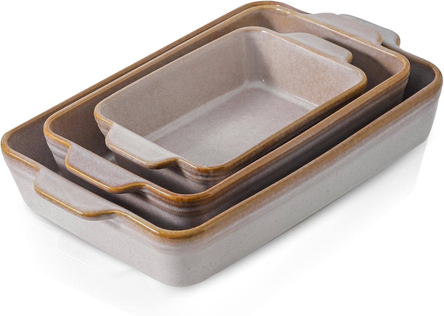 HVH 9x13 Baking Dish Set, Large Casserole Dishes for Oven, Ceramic Bakeware Set of 3, Rectangular Lasagne Pan Deep for Baking (Sand Color)