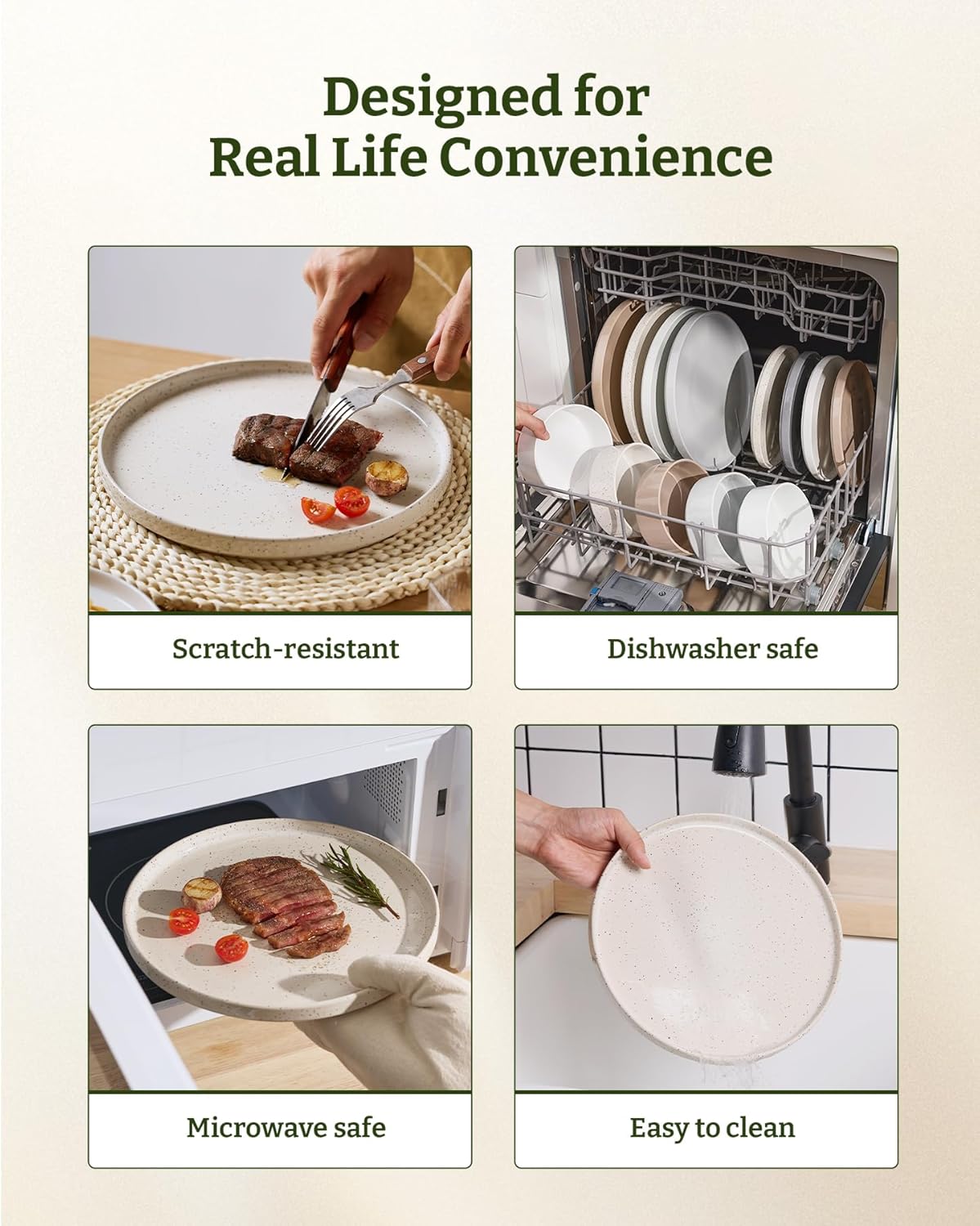 • DISHWASHER AND MICROWAVE SAFE: Famiware dishware sets are made of sturdy stoneware. Each plate and bowl is dishwasher safe and microwave safe.