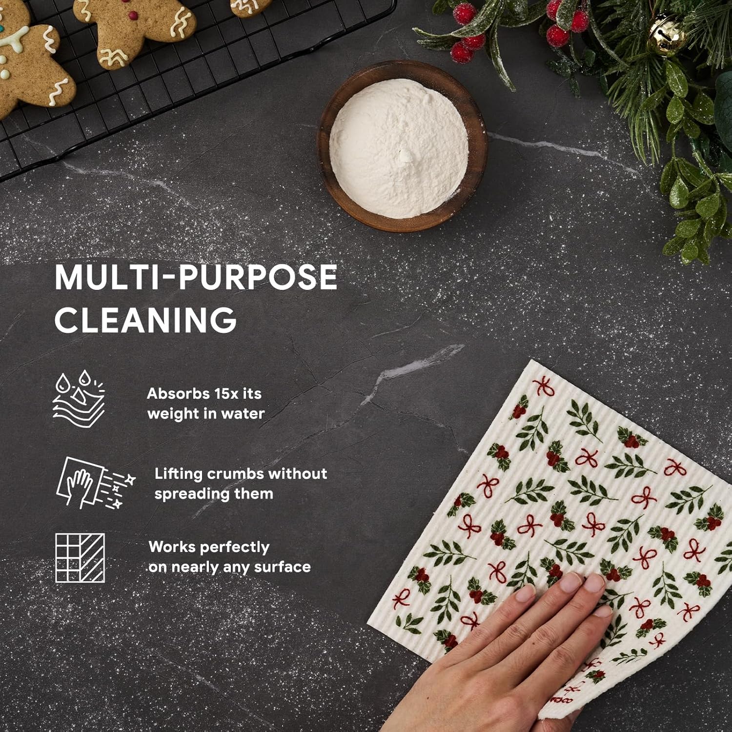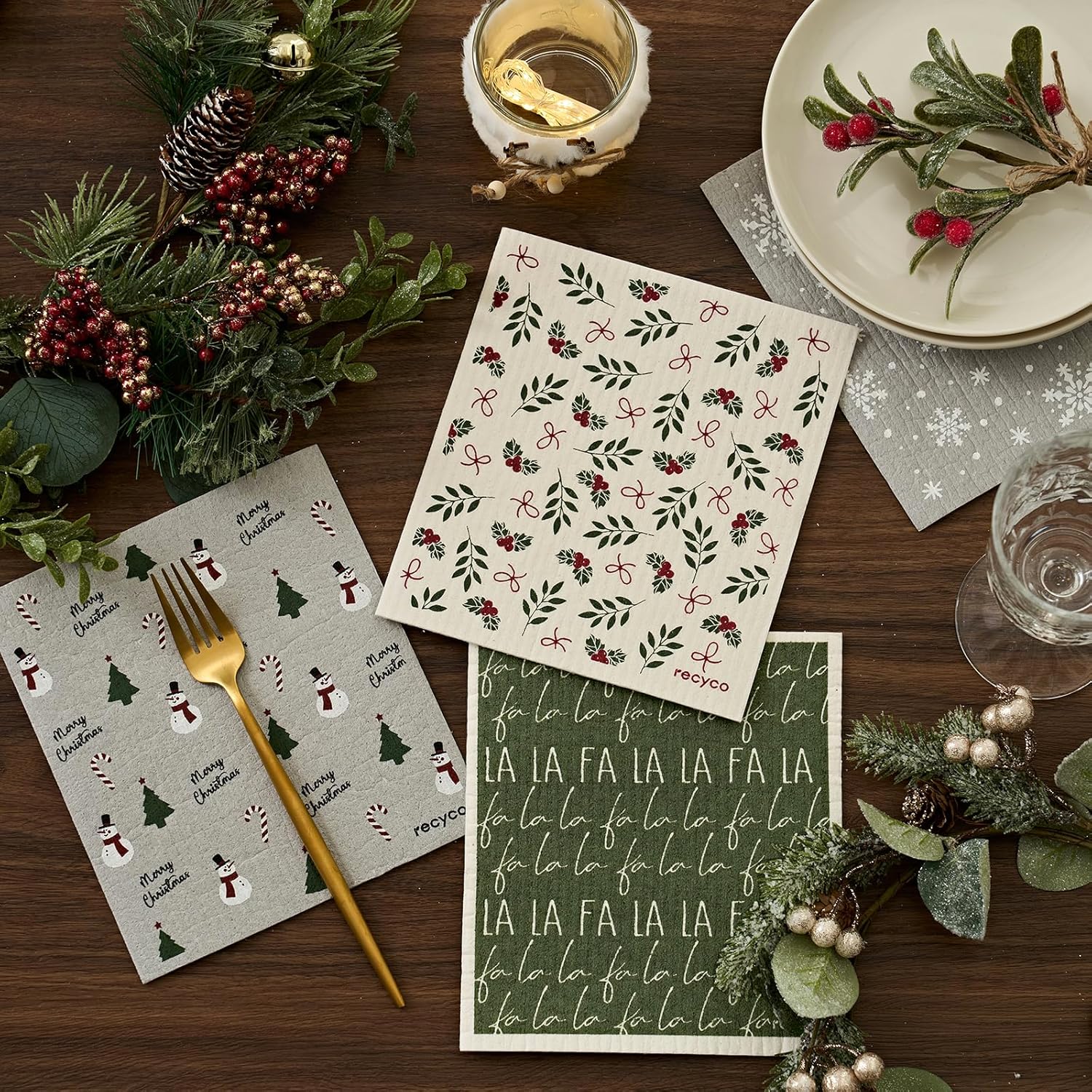 RECYCO 4 Pack Christmas Swedish Dishcloths for Kitchen | Jolly Holiday Washable Dish Towels | Cellulose Reusable Cleaning Paper Towels | Absorbent Counter Dish Cloth Sponge Kitchen Wipes, 7" x 8"