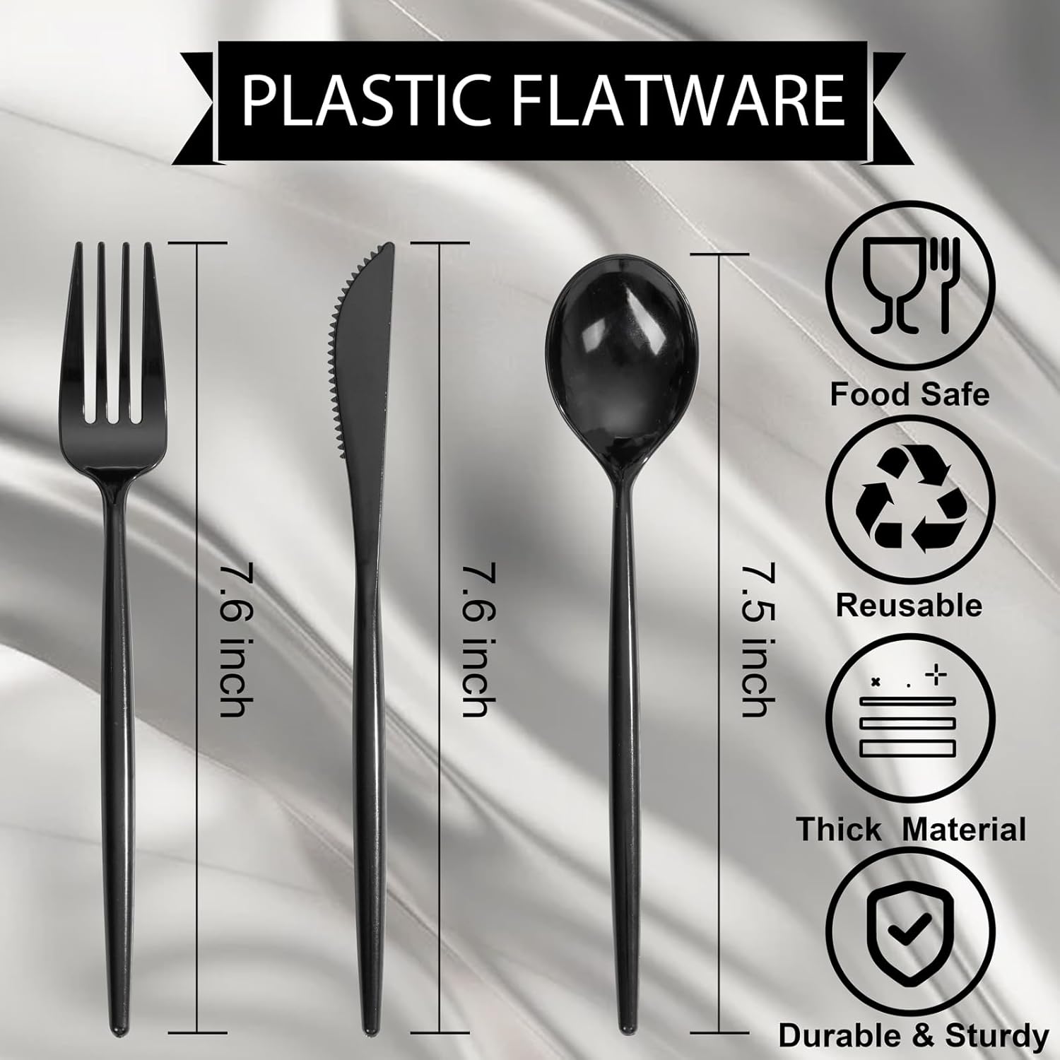 • Elegant Black Design:Whether you're enjoying a casual lunch or hosting a fancy dinner party.These black plastic silverware are ergonomic provide a comfortable dining experience for everybody.These black silverware are built to withstand the rigors of everyday use and are crafted with a modern design that is sure to impress your guests