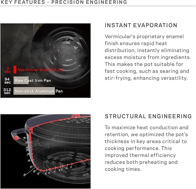 • Instant Evaporation: With Vermicular’s proprietary enamel coating, the pot quickly eliminates surface moisture, making the pot ideal for fast cooking methods like searing, stir-frying, and steam-roasting.