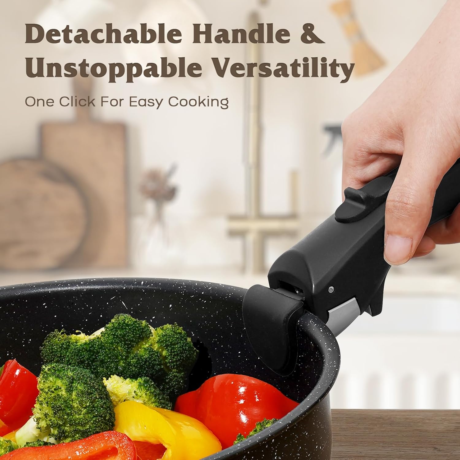 • Nonstick Excellence: Crafted with a premium nonstick coating, our detachable handle pots and pans set ensures a seamless cooking and cleaning experience. Enjoy the freedom to cook with less oil and experience effortless food release, making your favorite recipes healthier and more enjoyable