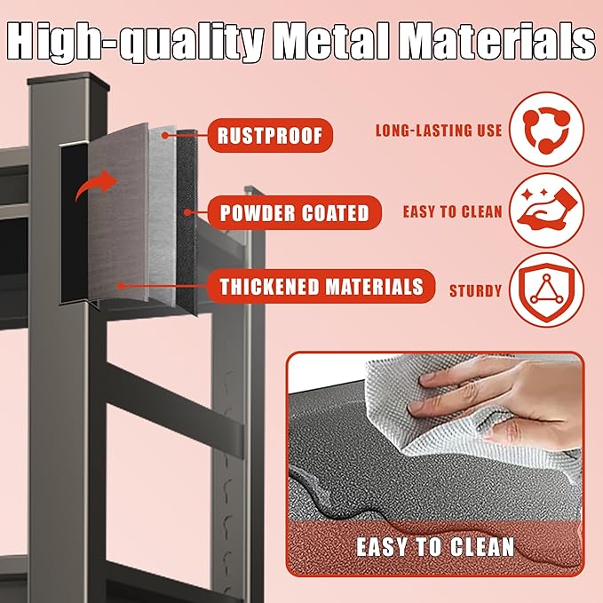 • 【Stable, Durable and Rust-Resistant Kitchen Storage Shelves】This kitchen steel shelves are made of high quality metal, metal support strips underneath each shelf provide stability and durability to the kitchen shelves. The surface of the metal shelf dividers is made of high quality powder coating, which is easy to clean, moisture-proof and rust-proof. Ensure the surface of the shelves won't peel or oxidize after long term use, keep it like new!