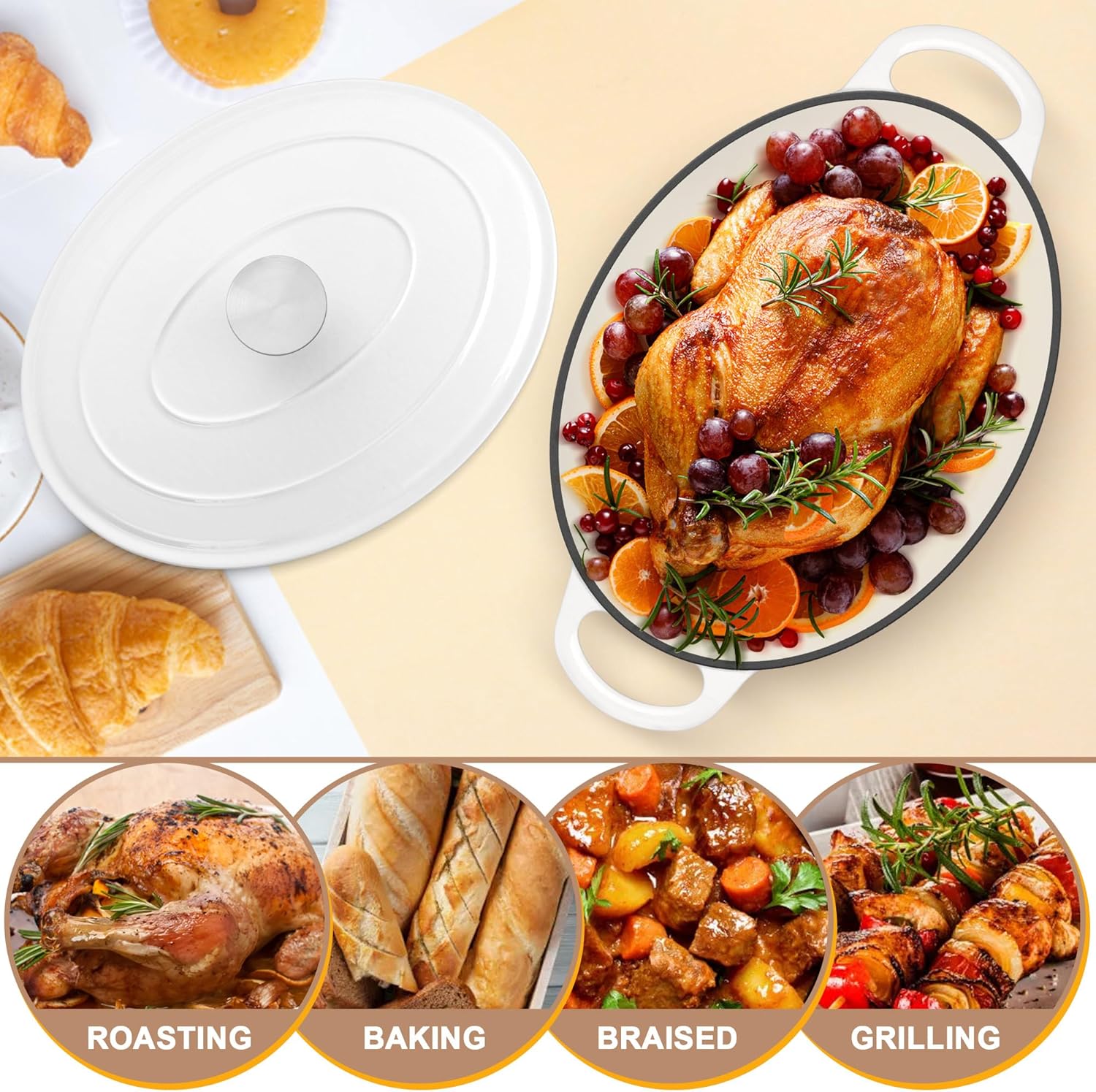 • PERFECT SIZE & MULTI PURPOSE: Oval shape with 7qt ample size perfect for a full sized chicken or oblong sourdough loaf, Go nicely from oven for baking artisan bread/casserole to stove top for soup/stews, Or directly to table for serving with its rustic white look, Versatile for broiling, braising, frying, sauteing