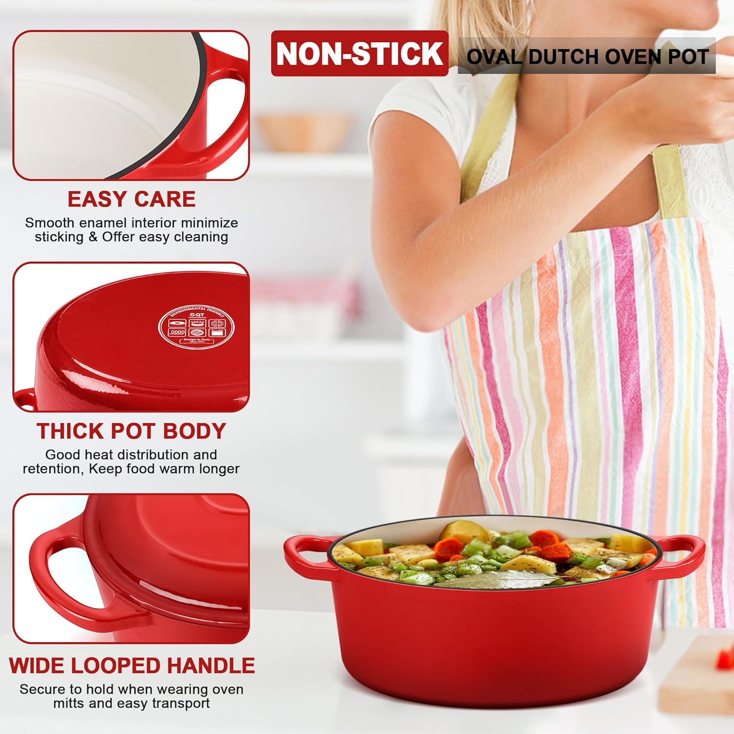 • PERFECT SIZE & MULTI PURPOSE: Oval shape with 5qt ample size perfect for a full sized chicken or oblong sourdough loaf, Go nicely from oven for baking artisan bread/casserole to stove top for soup/stews, Or directly to table for serving with its rustic red look, Versatile for broiling, braising, frying, sauteing