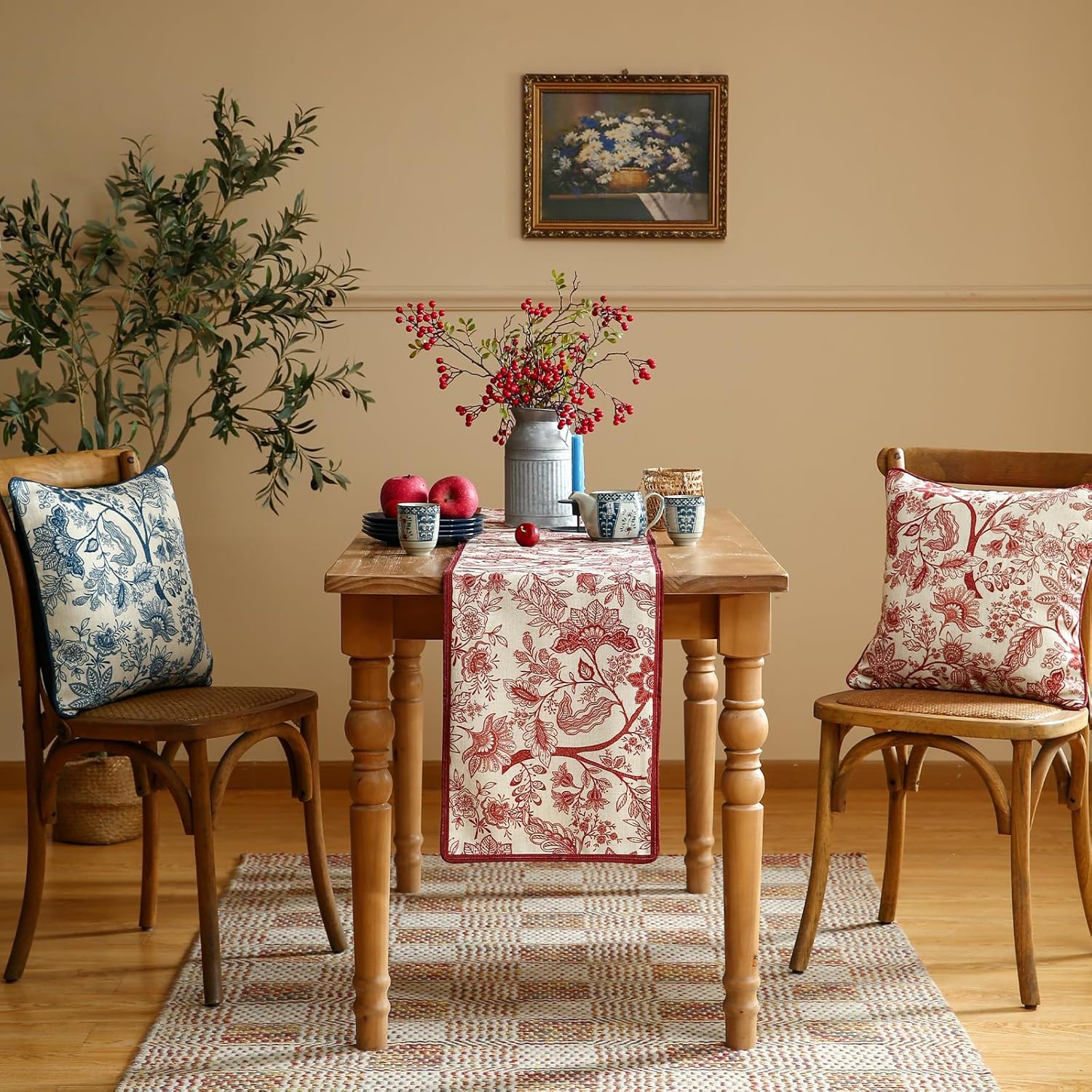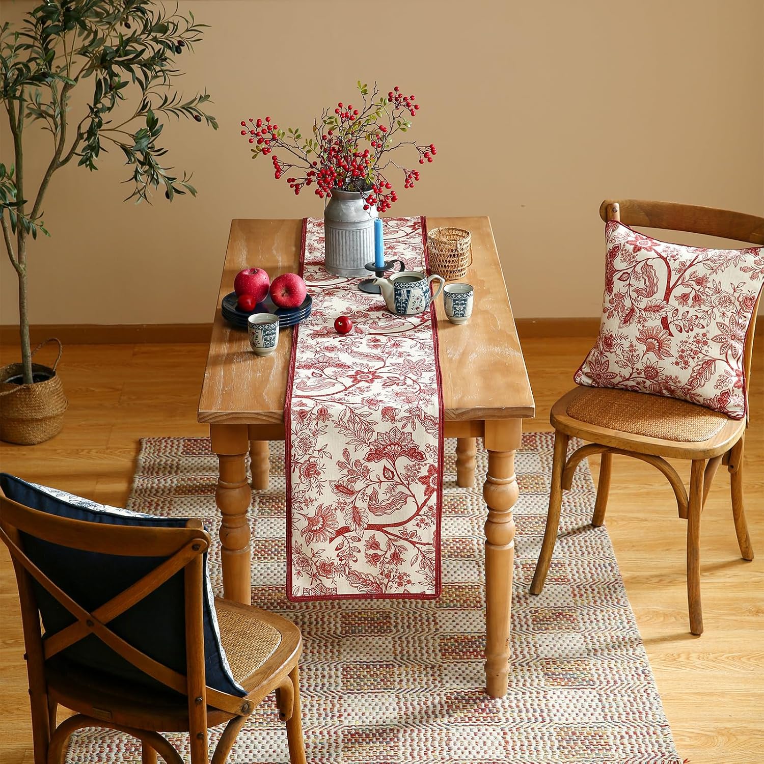 ISAENNE Designer Chinoiserie Elegant Linen Table Runner 87 Inches Long,Red Floral Pattern Decor Table Runners for Thanksgiving,Dining Room,Banquet,Kitchen Tables,Christmas,12"*87"-Ruyi A