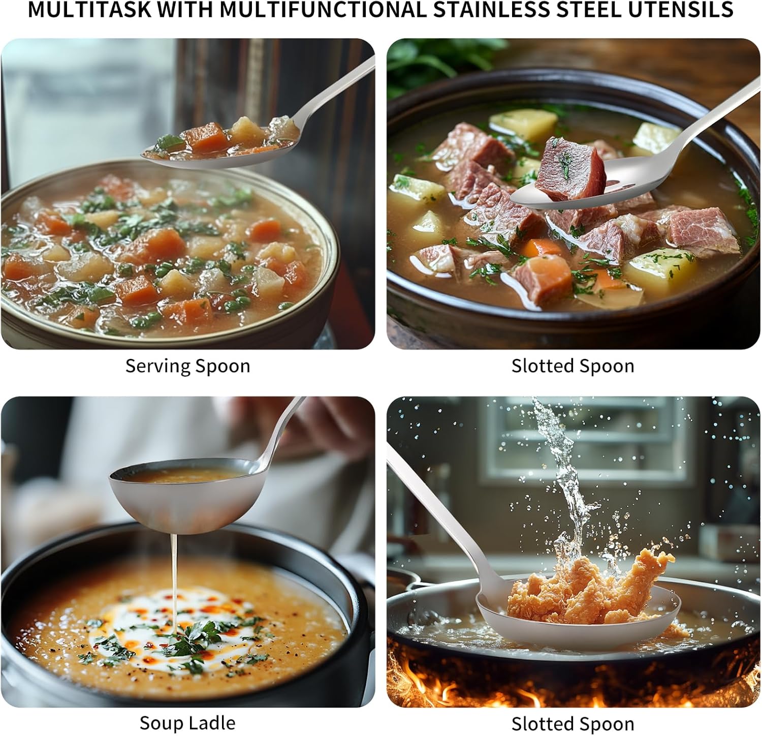 • 【304 Stainless Steel Kitchenware】: Constructed from premium food-grade stainless steel, this kitchenware is capable of withstanding high temperatures up to 800°C (1472°F). It features a well-balanced weight distribution, exceptional strength, and scratch resistance, thereby ensuring the safety and well-being of your family. The ergonomic swan handle design enhances grip comfort and usability