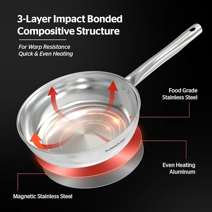 SUNHOUSE 10 Inch Tri-Ply Stainless Steel Frying Pan, Whole-Clad No Coatings Skillet with Stay-cool Handle for Cooking, Durable & Oven Safe to 500°F, Dishwasher Safe, Compatible with All Cooktops