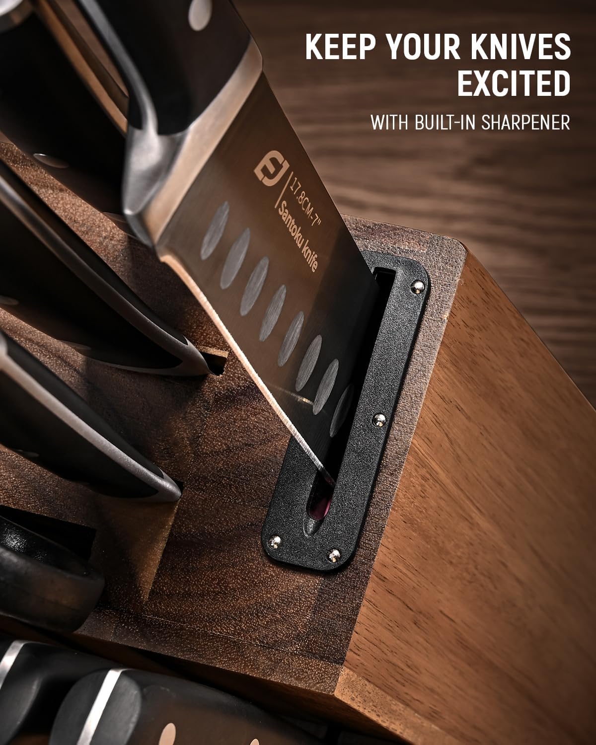 • TRUST FOR LIFETIME - Expertly crafted kitchen knives, boasting durability and backed by a lifetime satisfaction guarantee. Rest assured, this wooden knife block set carries our unwavering commitment to quality.