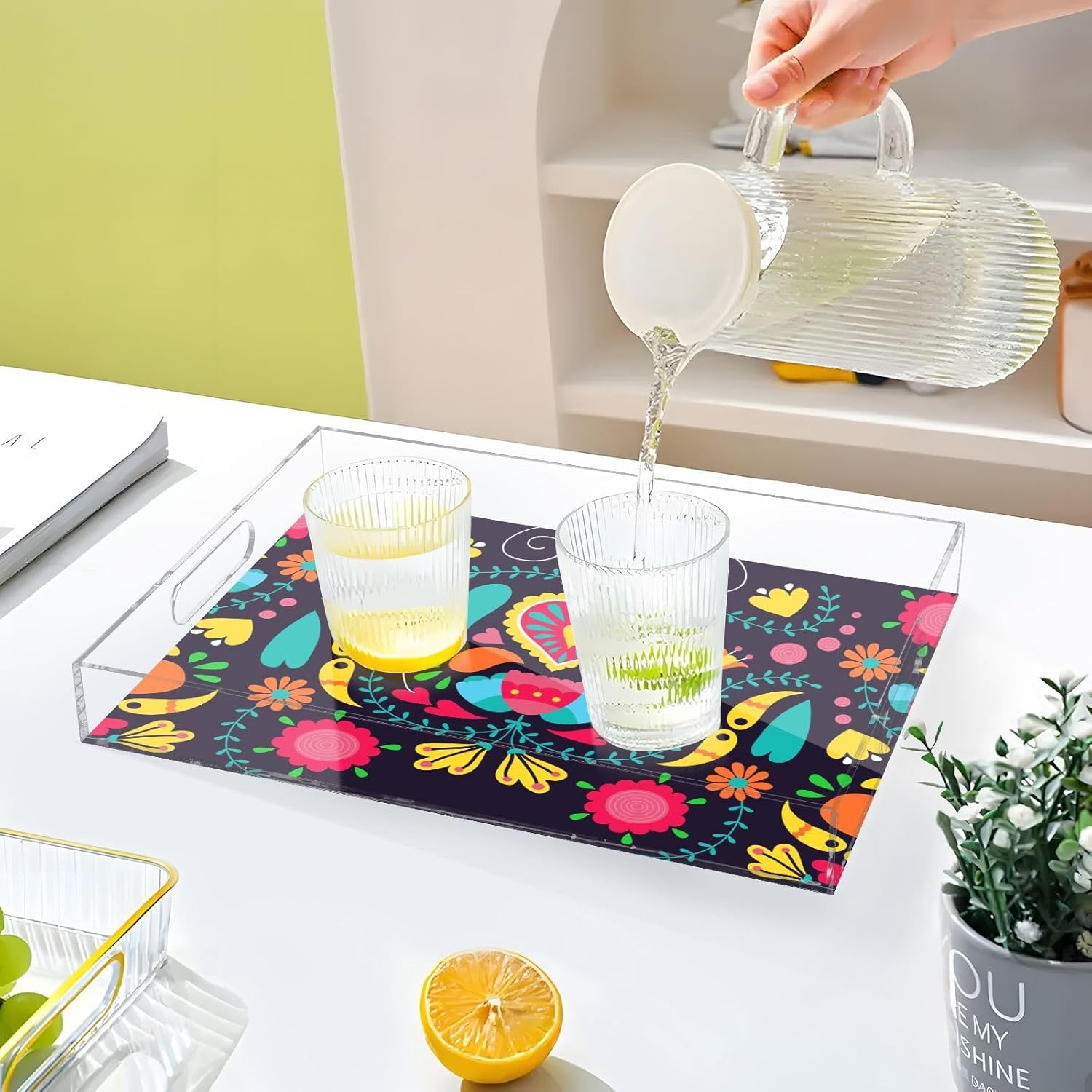 • Premium Acrylic Material: The acrylic serving tray made from durable acrylic with a smooth edge design to ensure safe handling, while the spill-proof design helps keep your home tidy