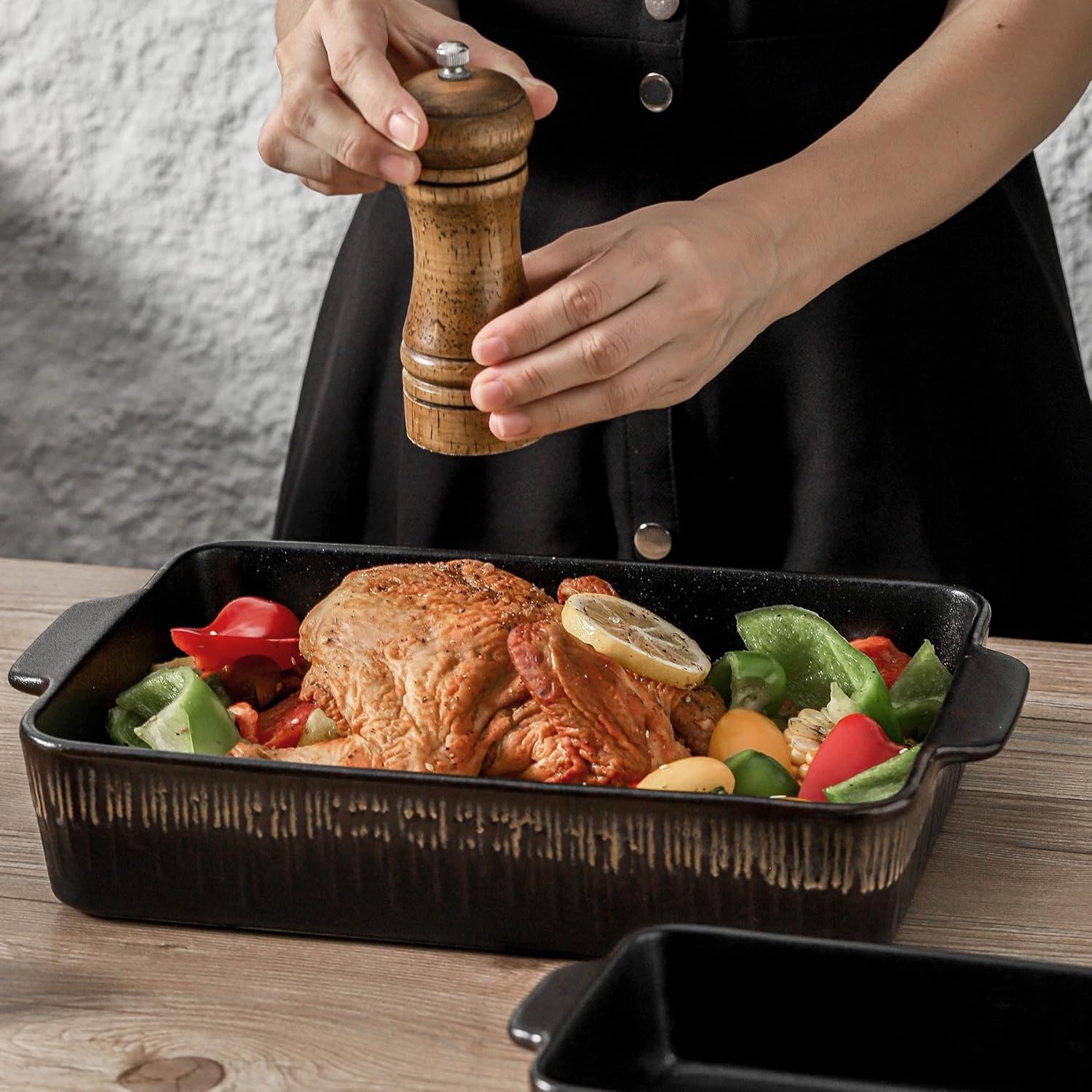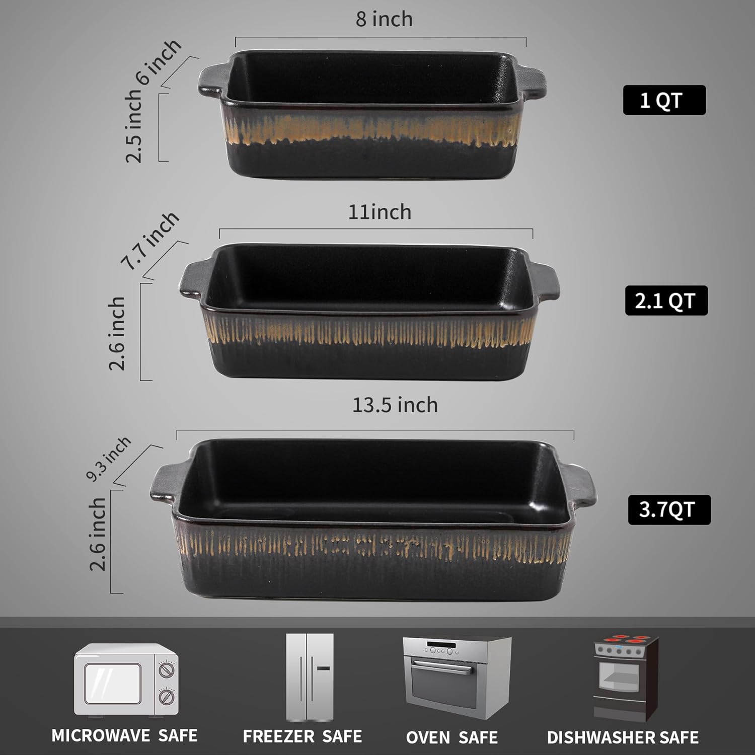 Bakeware Set, Ceramic Baking Dish, Rectangular Baking Pans Set, Casserole Dish for Cooking, Cake Dinner, Kitchen 9 x 13 Inches, 3-Piece, Stripe Series (Rough Black)