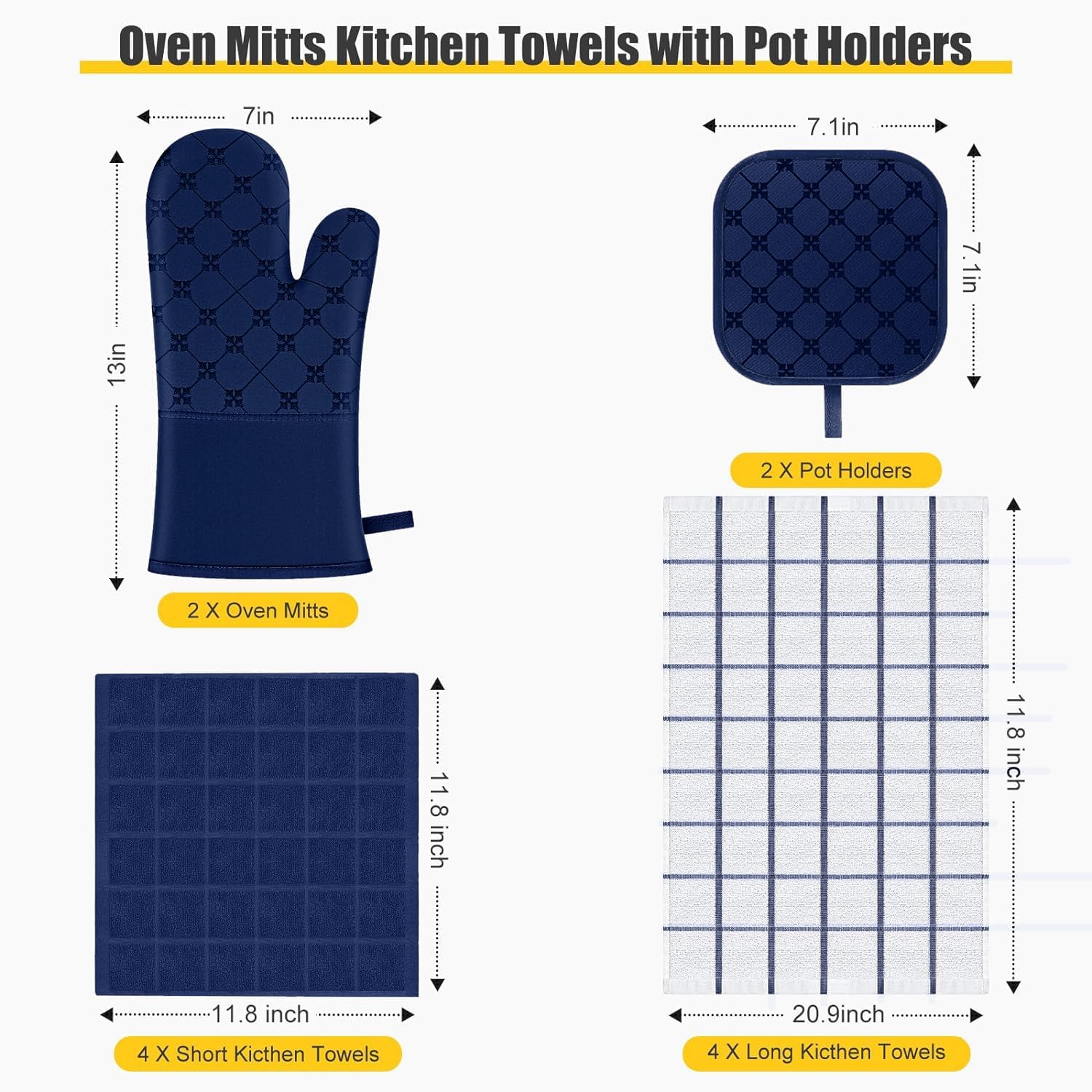 Oven Mitts Kitchen Towels Dishcloths with Pot Holders Sets 12PCS,Dish Towels Sets,Oven Gloves Pot Pads Heat Resistant 500 Degrees with Non-Slip Silicone Surface for Cooking Baking Grilling-Marine Blue