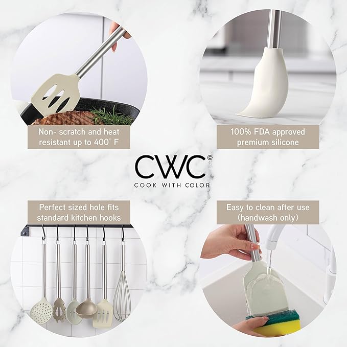 • Make the smart choice with a long lasting set that is constructed from premium food grade silicone to protect your nonstick cookware from scratches and scrapes. Silicone allows for less buildup and mess so these tools will be super easy to clean. Top rack dishwasher safe. Resistant to odors and stains.