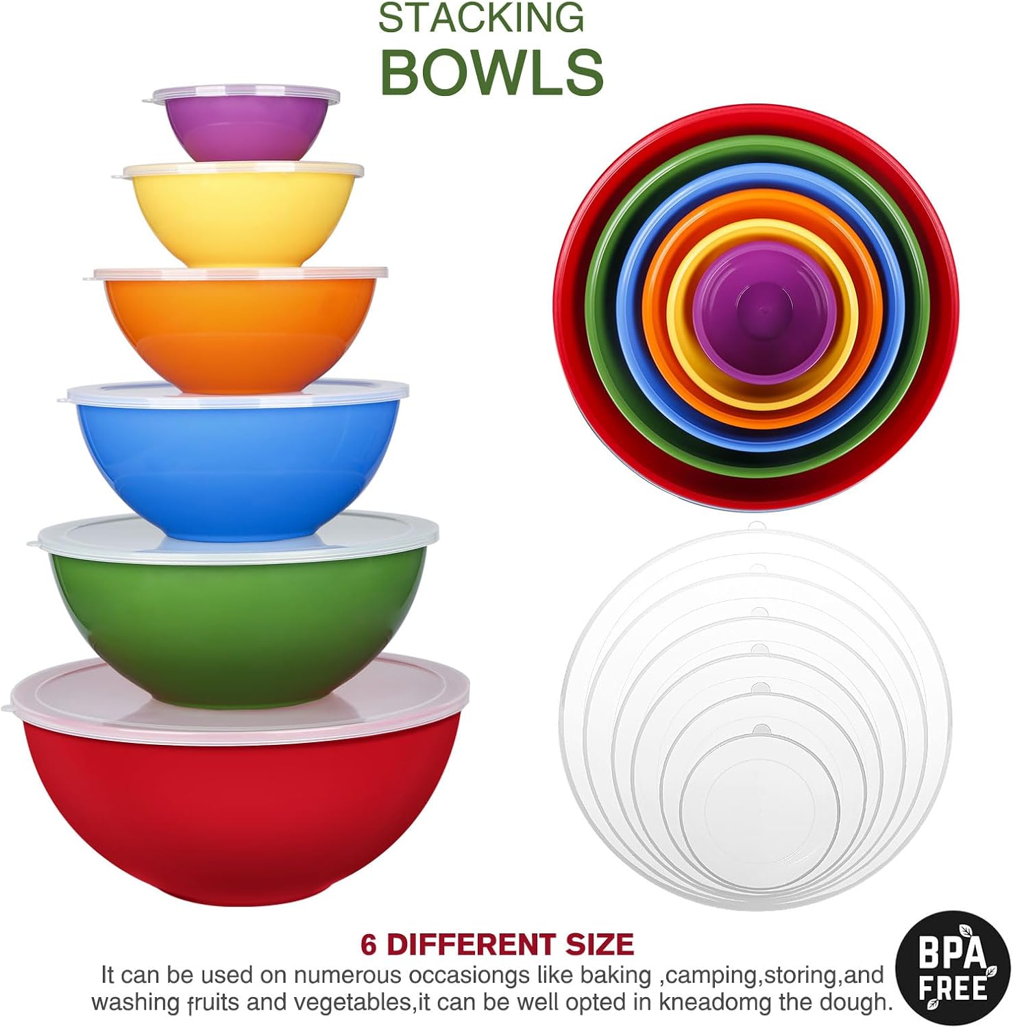 • 🍓【A Variety of Sizes】: This nesting bowl set is fit for all your prep and storage needs, such as mixing batter, storing leftovers, tossing salad, or marinating. The set includes 6 plastic bowls with 6 transparent lids in multiple sizes: 0.25L, 0.6L,1.15L,2L,3.35L and 5.25L.